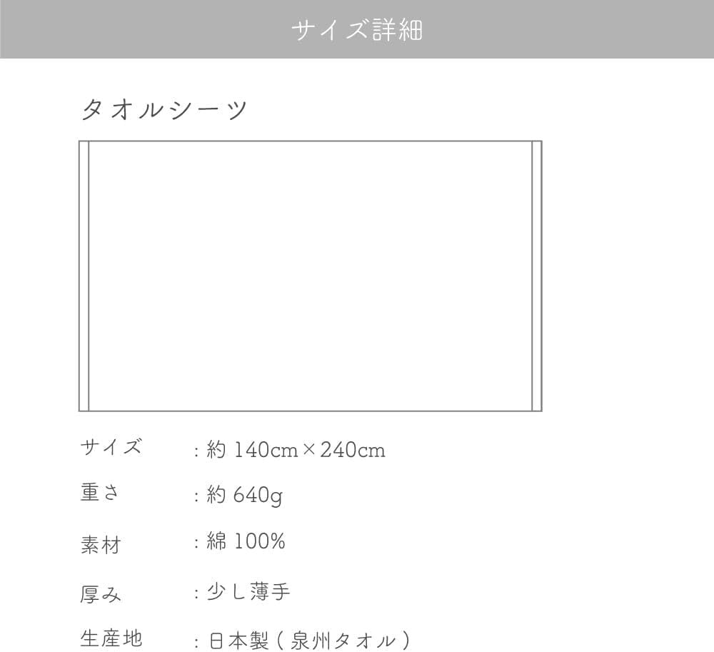 【シングルタオルシーツ1枚】生産地:日本製(泉州タオル) 本体重量:640g(1枚あたり) 本体サイズ:約140×240cm(1枚あたり) 素材 : 綿100%