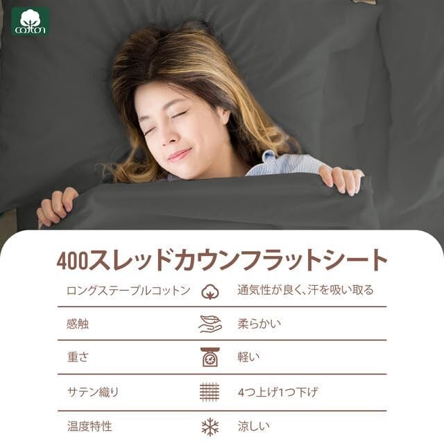 このフラットシーツは、400スレッドカウントの高級素材使用で、しなやかさと柔らかさが特徴です。長繊維(ロングステープル)コットンを採用しており、丈夫さと耐久性にも優れ、長くご使用いただけます。毎晩の睡眠がより快適で特別なものへと変わることでしょう。