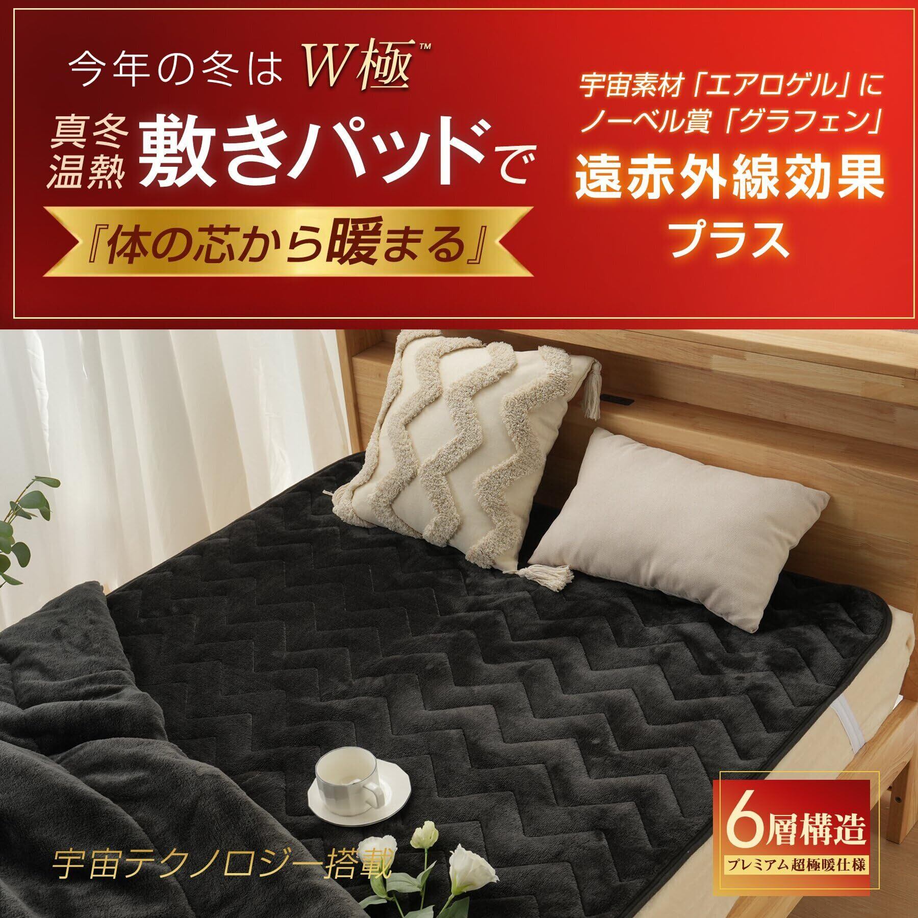 【あったか 敷きパッド シングル 冬】ノーベル賞『グラフェン』とNASA宇宙服『エアロゲル』、この二つの最先端テクノロジー素材をメインに、高機能抗菌防臭中わたなど機能が異なる4種のハイテク中わたを採用。側生地には、日本伝統の起毛技術から生まれたニューマイヤ生地を採用し、魔法瓶効果によって外からの冷気をシャットアウトし、体温を反射して温かさを保つアルミ銀蒸着加工を施した特殊裏地で挟んだ、W極唯一無二の超高機能冬用敷きパッドが新登場。