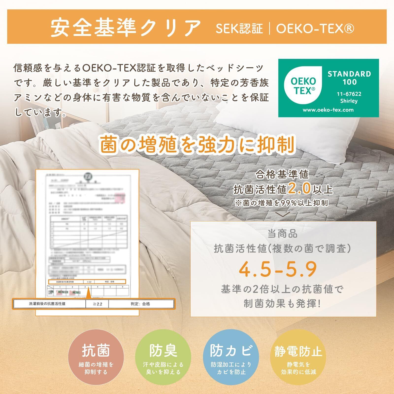 特徴 SEK + OEKO-TEX®認証, 抗菌防臭, 敷きパッド×ボックスシーツの2WAY仕様, 洗える, 高級色牢度(JIS L 0844 4〜5級)