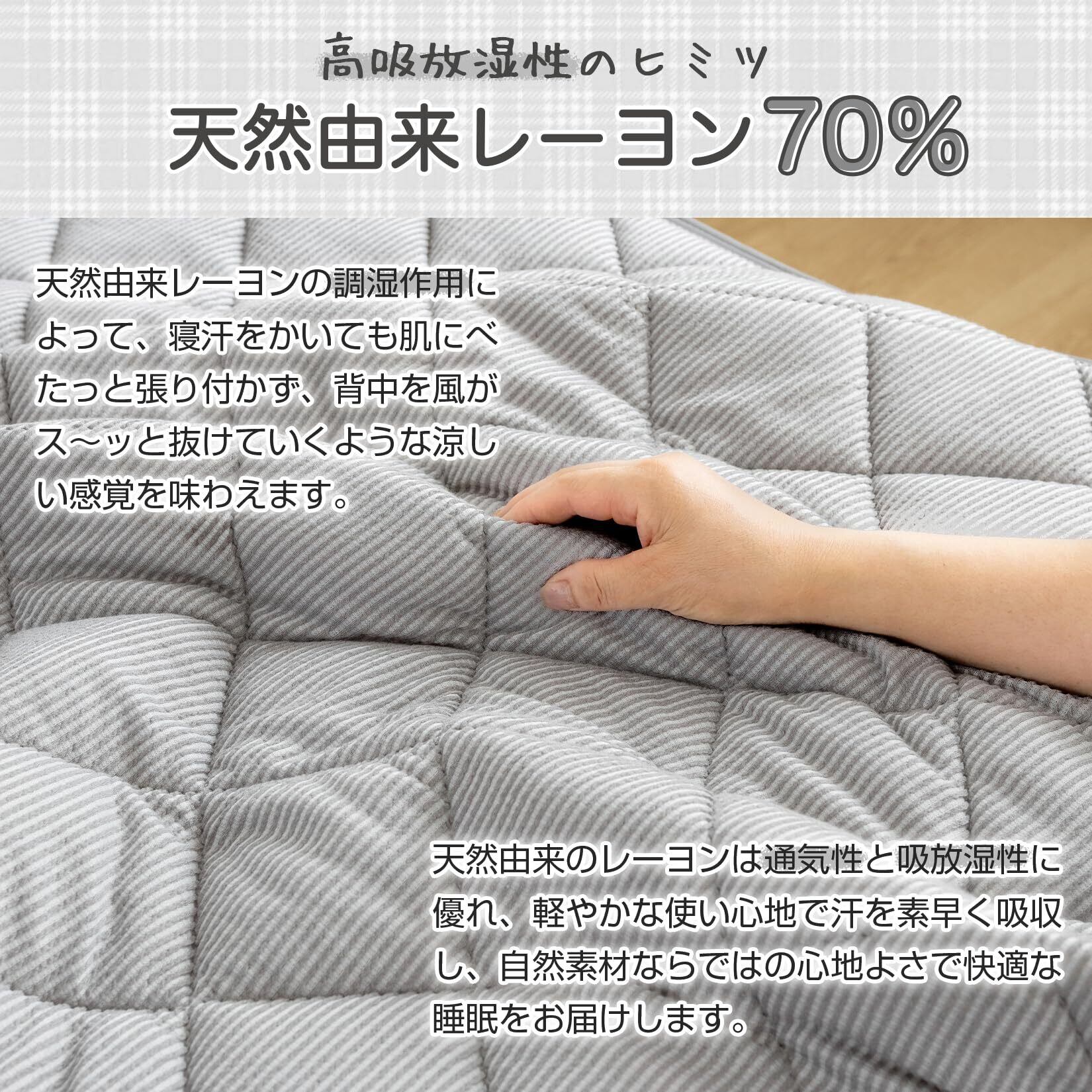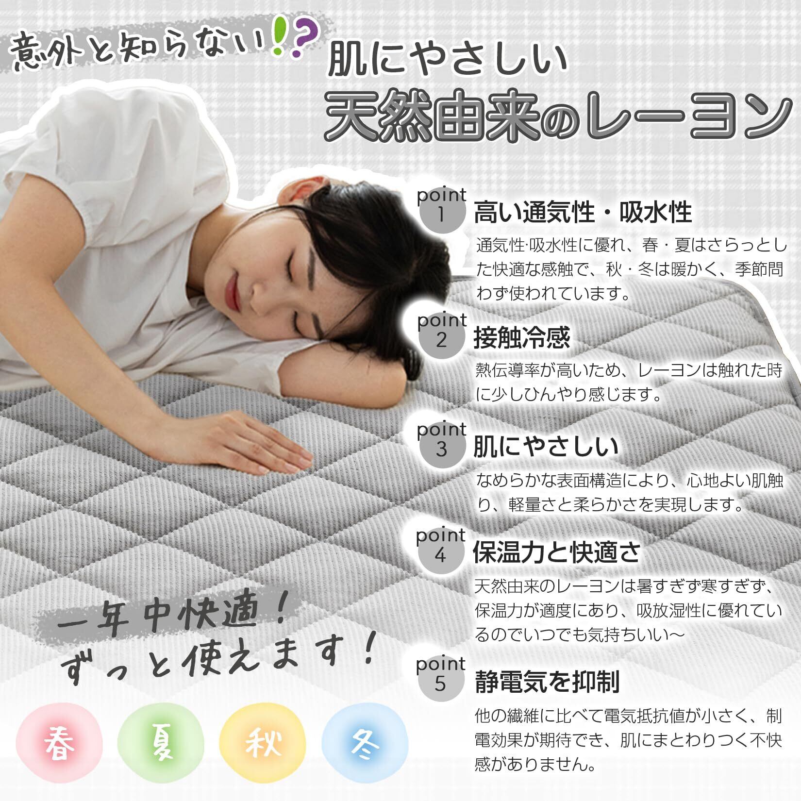 【一年中快適な寝心地】春・夏はさらっとした肌触りで爽やかに、秋・冬はふんわりと暖かく。天然由来のレーヨンが汗をしっかり吸収し、ムレを軽減することで、季節を問わず、長期間快適にご使用いただけます。