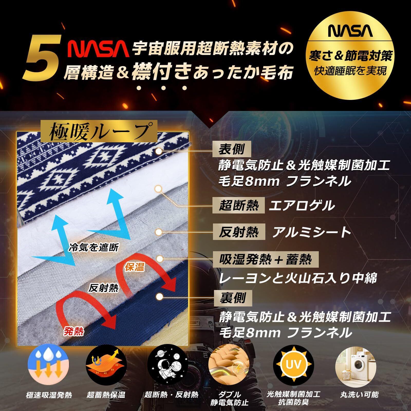 【極暖ループ設計:5層構造&襟付き】この毛布は5層構造のデザインです。①層目:高密度の<静電気防止・光触媒制菌加工>フランネル表地、②層目:NASAの宇宙服にも使用される<超断熱>エアロゲルシート、③層目:柔らかい<防音・断熱>アルミシート、④層目:<超吸湿発熱>レーヨン&HEATSTARsolar<蓄熱保温>中綿、⑤層目:高密度で静電気防止と光触媒制菌加工のフランネル裏地です。この5層でしっかり保温のループを生成し、さらに、冬用毛布は襟付き仕様で、首と肩の接触部分に柔らかくて二重構造の衿を付けて、冷気の侵入を防ぎ、さすがに上品な暖かくふわふわ安眠ブランケットです。