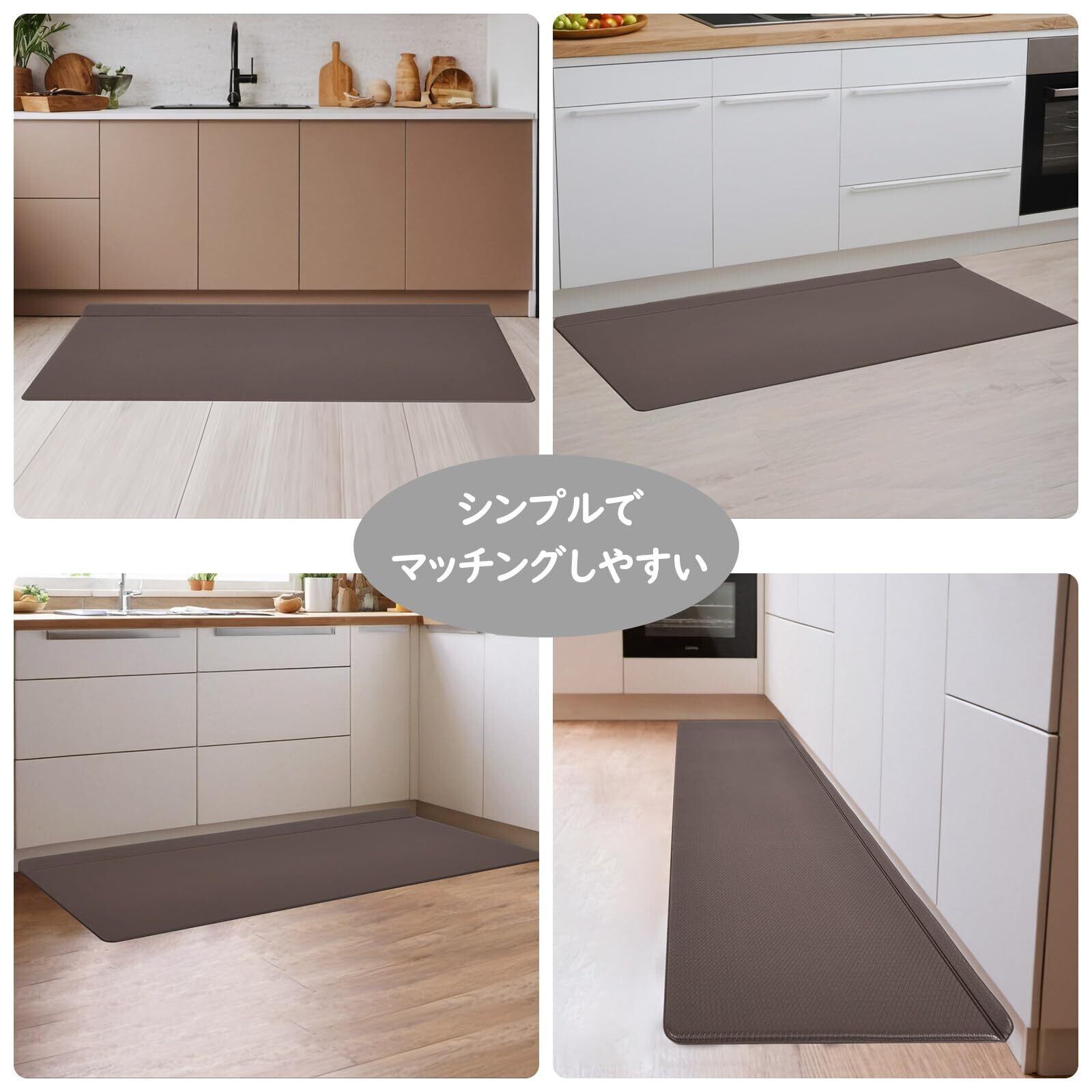 「Baibu Home」のキッチンマットは、44x120cmのL字折り目付きデザインで、スタイリッシュなブラウンの無地が、さまざまなキッチンにマッチします。厚さ8mmの低反発クッションを使用し、立ち仕事でも疲れにくく、快適な時間を提供します。