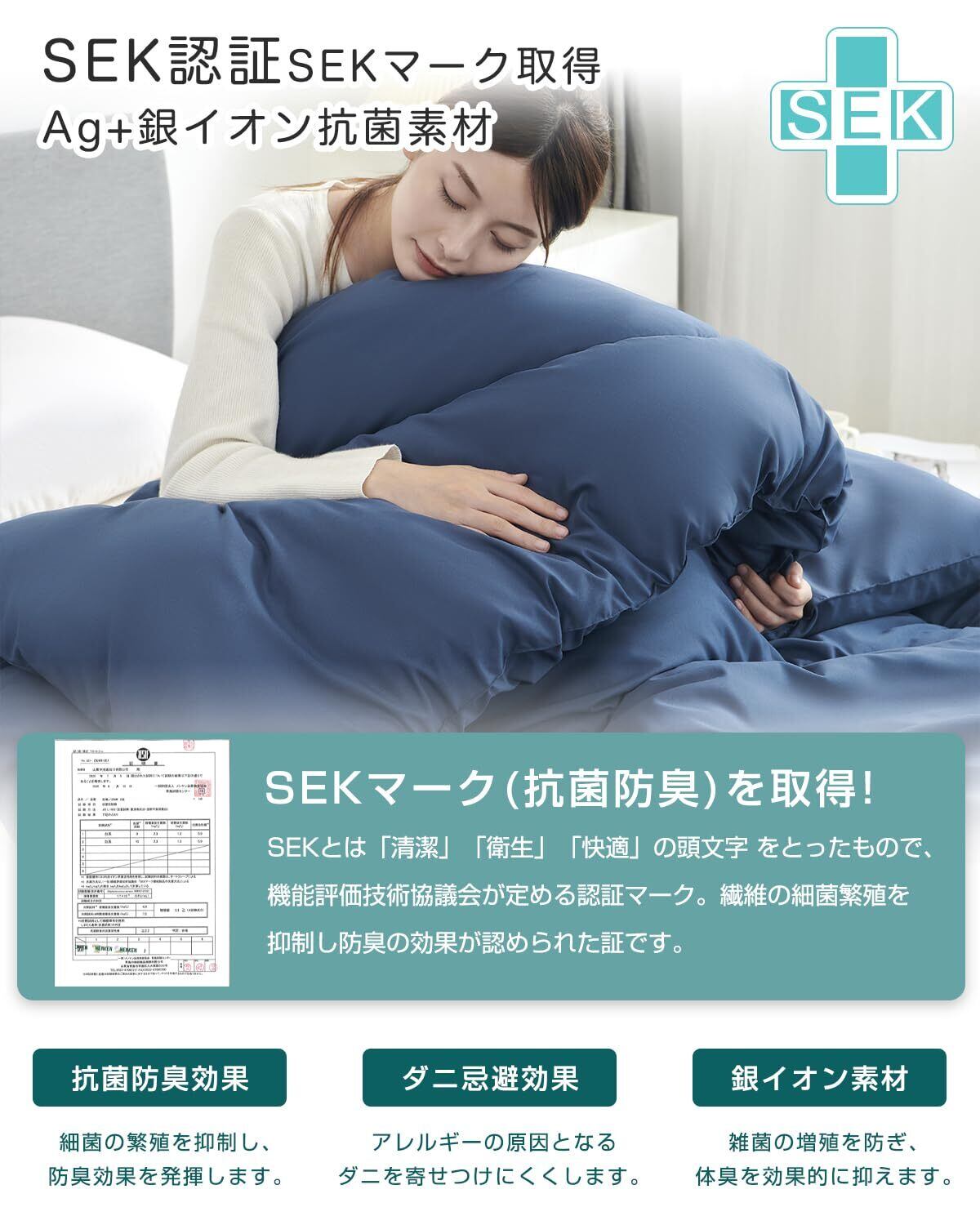 【SEK認証・Ag+銀イオン抗菌素材】抗菌防臭・防ダニ加工で細菌やダニの増殖を防ぎ、お子様やアレルギー体質の方にも安心してお使いいただけます。さらに、銀イオンも雑菌の増殖を防ぎ、嫌なにおいを抑制します。