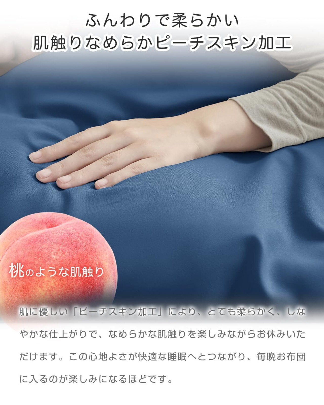 【ふんわり・柔らかい】肌に優しい「ピーチスキン加工」で、とても柔らかく、しなやかに仕上がっており、寝ているときも身体が包み込まれているような感覚を味わえます。