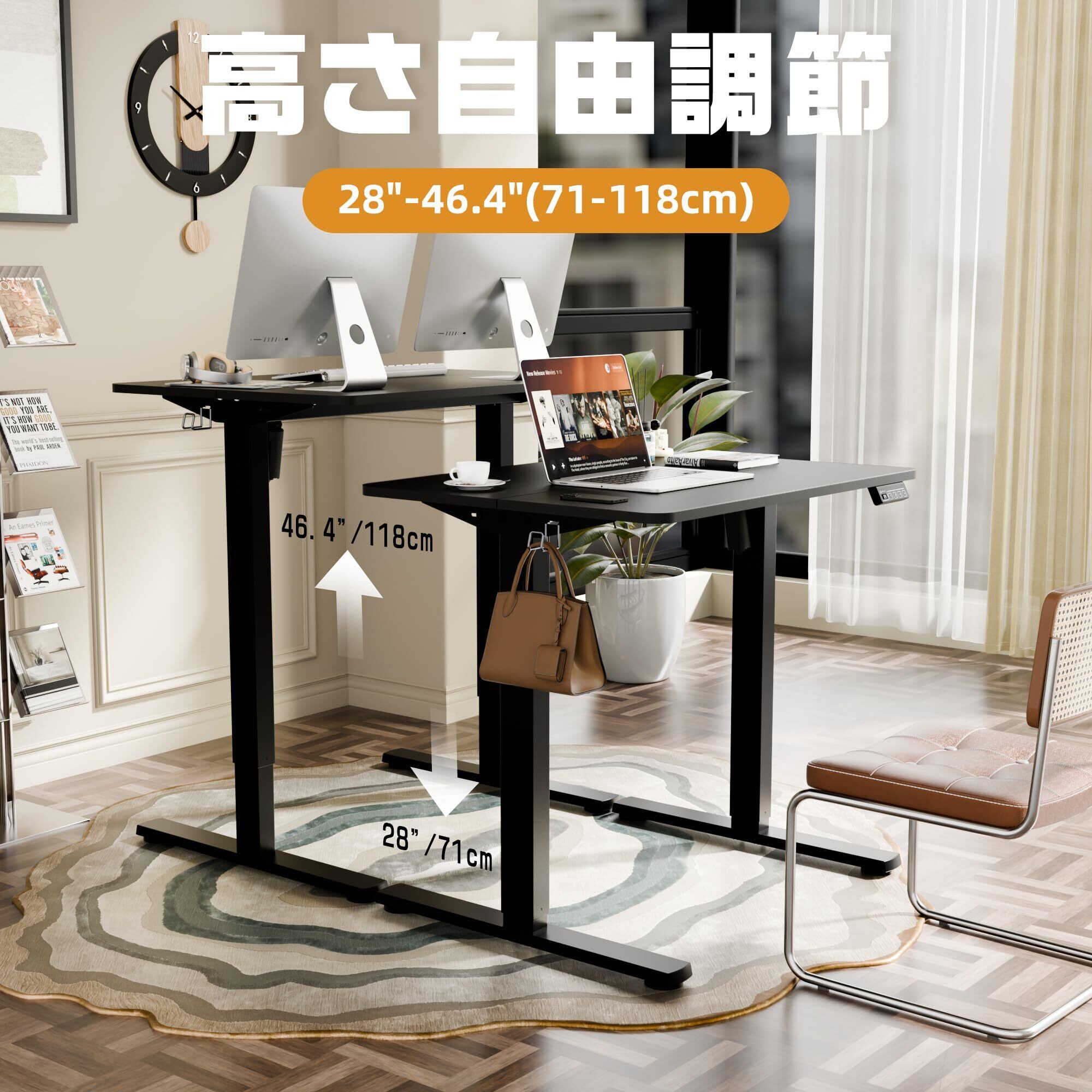 「昇降機能」 この電動昇降デスクは、先進の昇降システムを搭載しており、簡単なボタン操作でデスクの高さを調節することができます。スタンディングデスクとして使用したり、昇降式のゲーミングデスクとして利用したりすることができます。ワンタッチで切り替えられるので、快適で自由な作業体験を提供します。上下昇降範囲71-118CM。