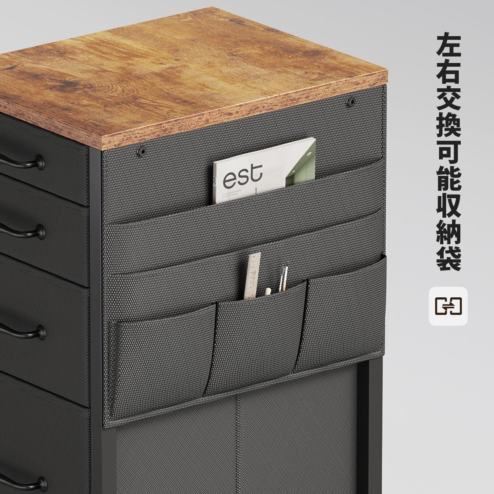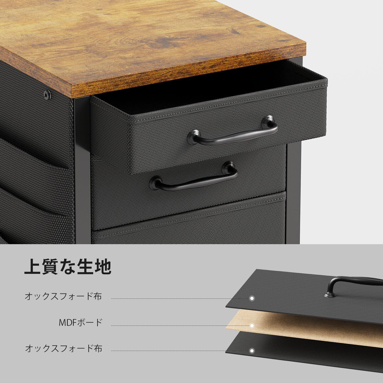 【温かみのあるデザイン】布制のキャビネットに金属のシンプルな取っ手と質感のある木制の天板を組み合わせました。シンプルなデザインと落ち着いた色合いで、単体の使用でも違和感なくインテリアになじみます。オフィスや寝室、リビングなど、さまざまな場所で使用できます。