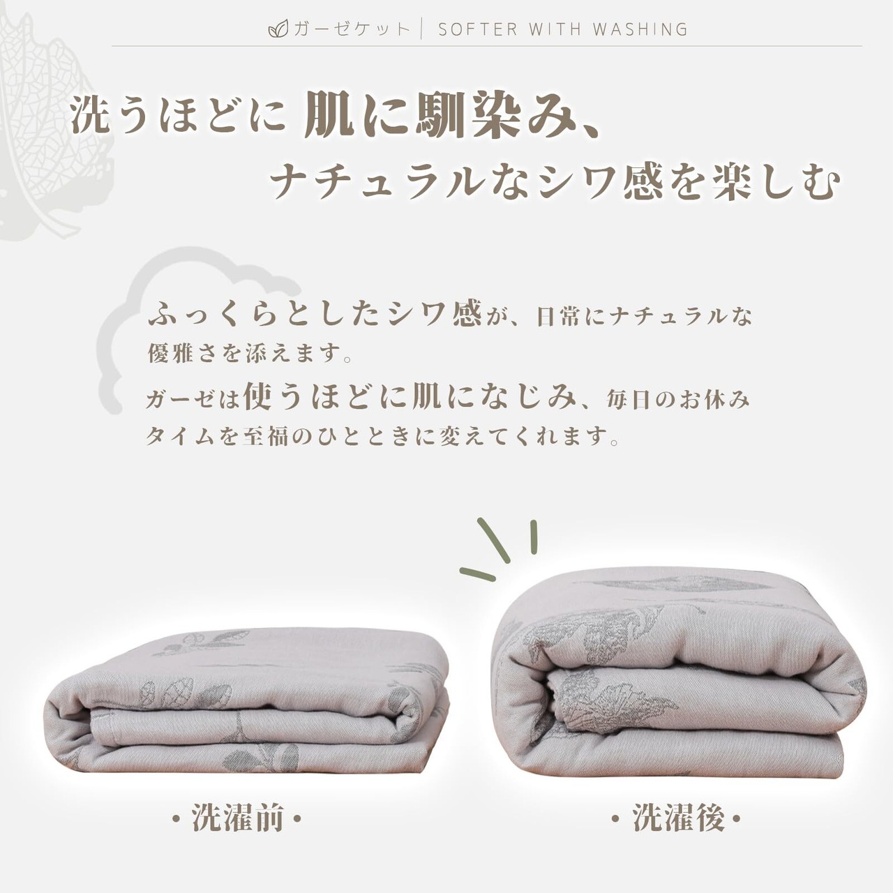 【自然が育むガーゼケット】天然素材の綿を100%使用したガーゼケットは、自然の恵みを肌に触れるたびに感じさせる柔らかさと優しさが格別です。化学繊維では味わえない天然コットンの風合いをお楽しみいただけます。敏感肌の方やお子様にも安心してお使いいただけるガーゼケットです。