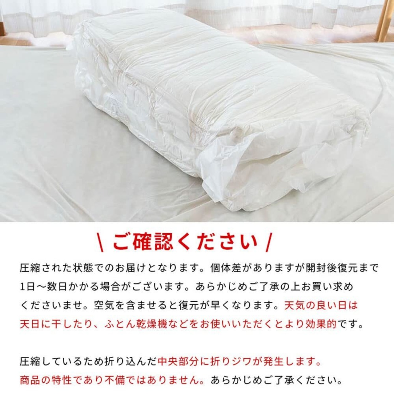 開封後の返品・交換は不可です。圧縮商品のため、届き次第1週間以内に開封してください。カッター等の鋭利な刃物は商品を傷つける可能性があるため避けてください。使用時はカバーやシーツを掛けてください。湿気の少ない場所に保管し、定期的に日干しや布団乾燥機を使用してください。家庭用洗濯機では洗えませんので、クリーニング店にご相談ください。