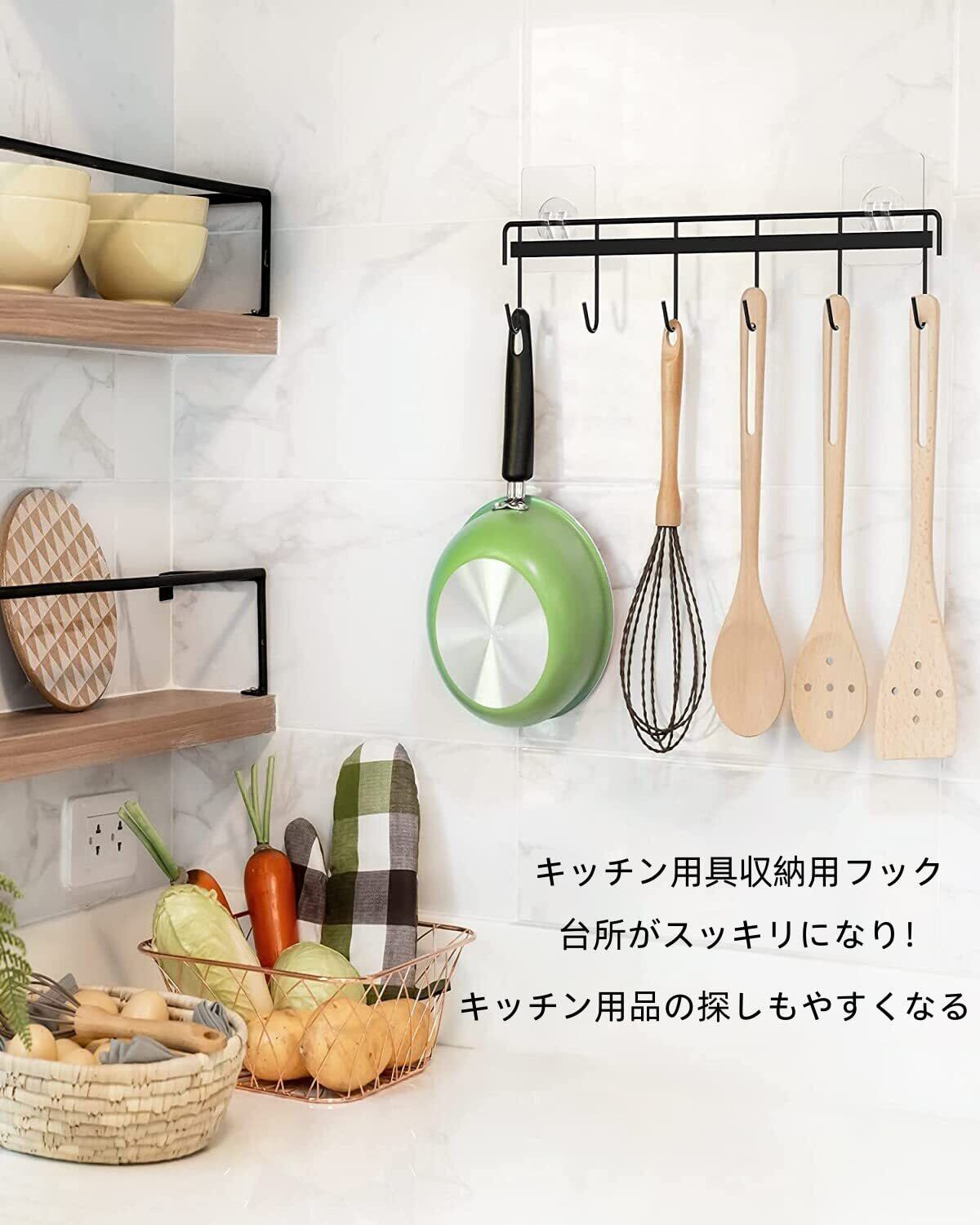 本製品には6つのフックが付属しており、鍋やフライパン、キッチン用具をすっきりと整理できます。必要な工具を効率よく収納することで、キッチン周りがすっきりと片付き、快適な料理環境を提供します。