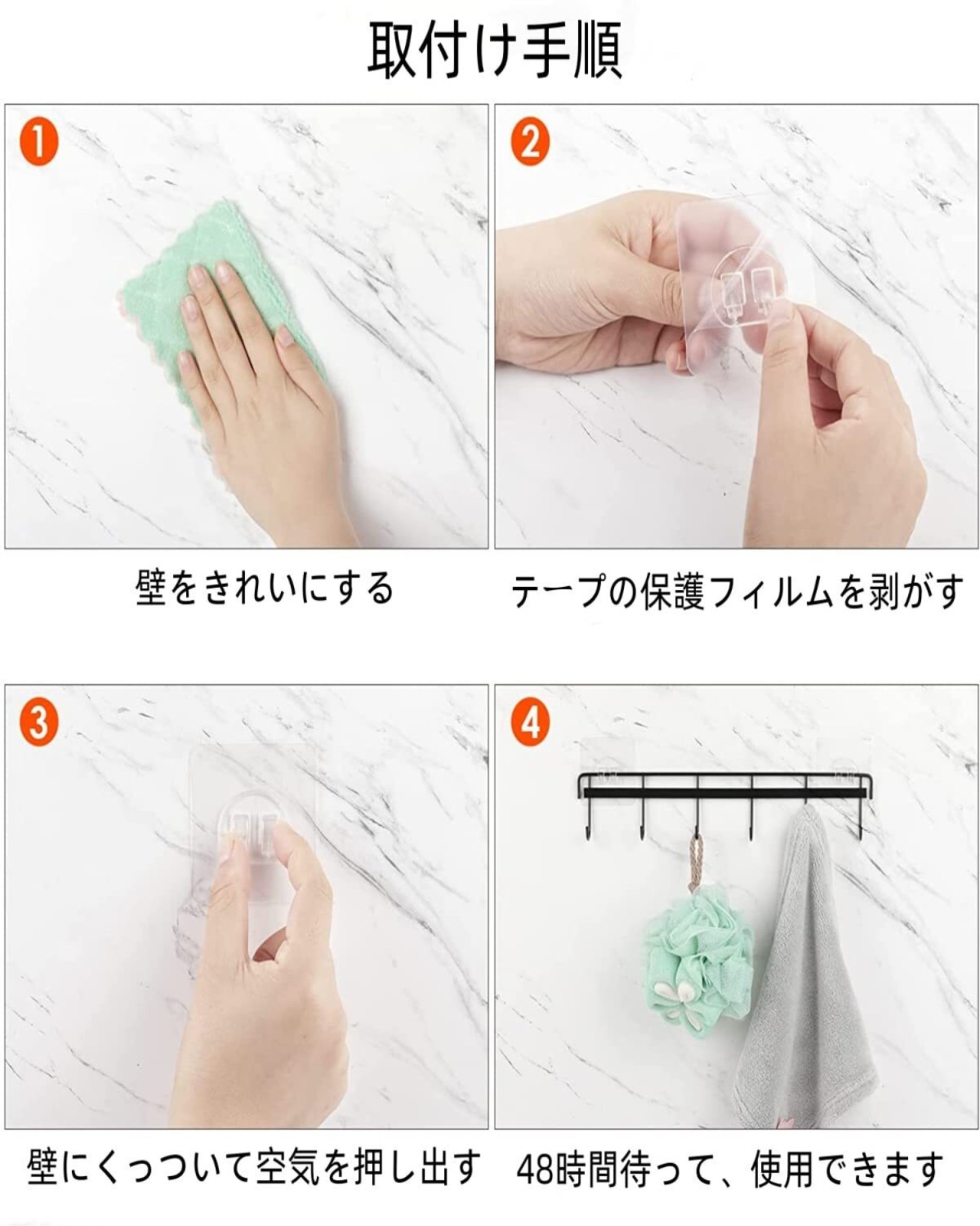 【取付け簡単】このキッチンツールフックは強力粘着テープで取り付け、壁に穴を開けたり、接着剤を塗ったりする必要なくて、壁を傷付けません。テープの保護フィルムを剥がし、キッチンツールフックをきれいで滑らかな壁に貼り付けて、48 時間後、キッチンツールフックを利用できます。PS:テープを外す方法:ヘアドライヤーでテープを加熱すると、数分後に跡を残さずにテープを剥がすことができます。