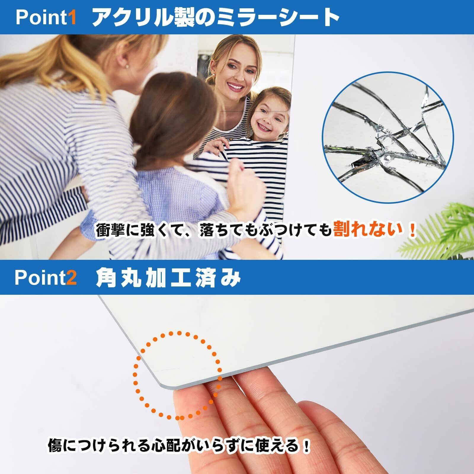 素材と工芸:鏡はいいアクリル素材で作られているので、ガラス製ミラーよりずいぶん軽くて、耐衝撃力が強くて、割れにくいです。さらに、飛散防止加工も角丸加工も施されており、万が一割れてしまっても鏡の破片による怪我しません。だから子供やペットがいる家庭でも利用できます