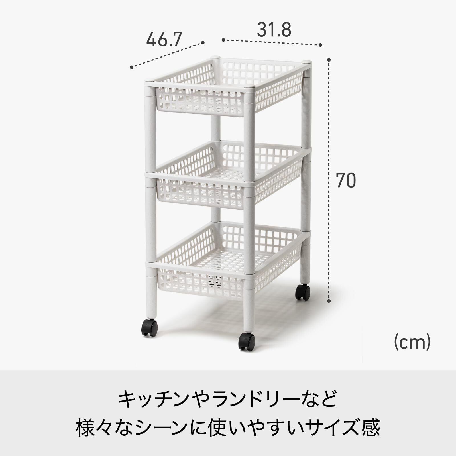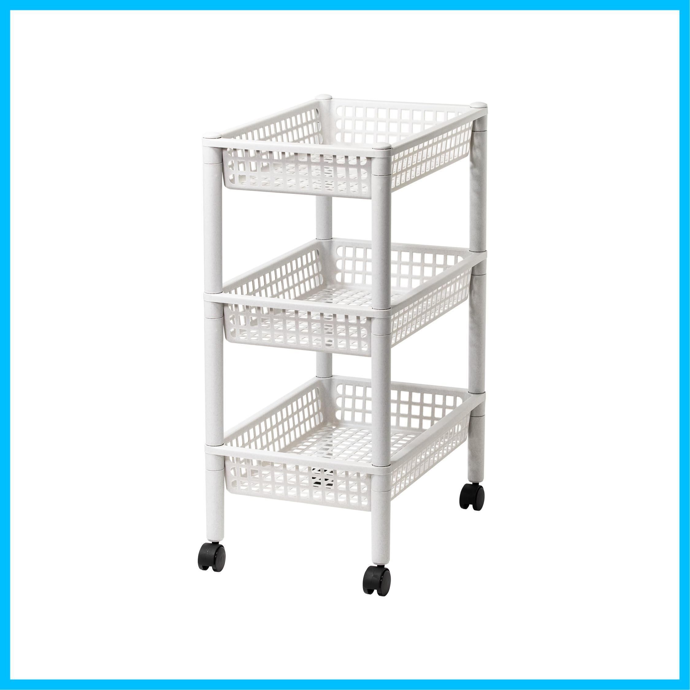 浅型バスケット3段タイプのワゴン。 浅型のバスケットなので小物も見やすくスッキリ収納。 キッチンで小物の収納や食品のストック、サニタリーでの小物収納など多目的に使える収納ワゴン。 掃除の際などに簡単に移動できるキャスター付き。 より ●デスクまわり、キッチン、バスルーム、ランドリーなどにぴったり、お部屋のスペースを上手に有効活用! ●バスケットの棚は小さな物も落ちにくいので動かすのも安心。容量もたっぷり! ●前後左右から取り出しできるから、横置き・縦置き、場所で変えられてとっても便利! ●キャスター付きで移動が楽ちん!