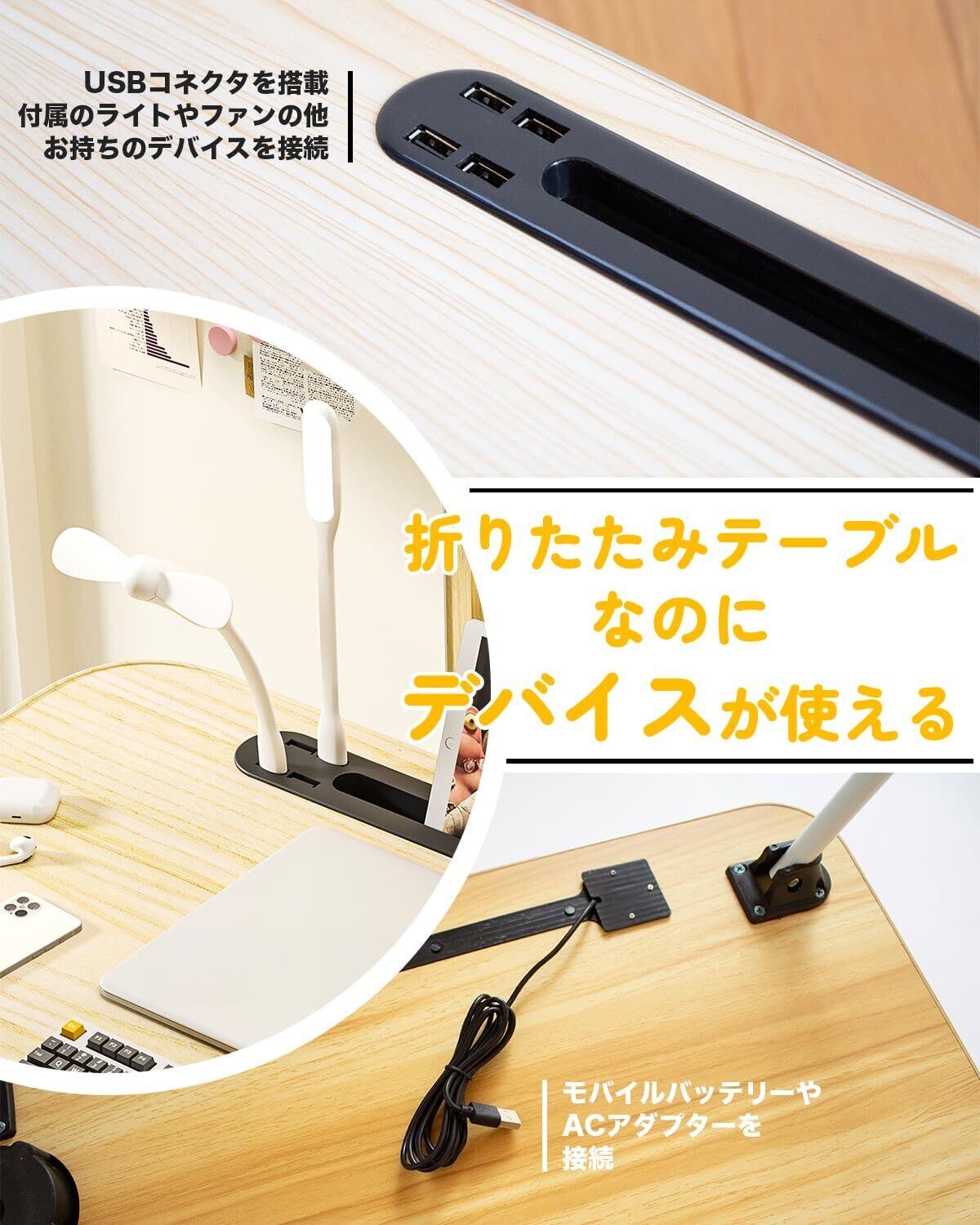 【入力USB-Aケーブル内蔵、出力USBポートA4個内蔵】このローテーブル入力USB-Aケーブル内蔵、出力USBポートAポートが4個内蔵され、モバイルバッテリーなどの電源に接続することで、付属品のミニファンとミニLEDが使えるようになります。