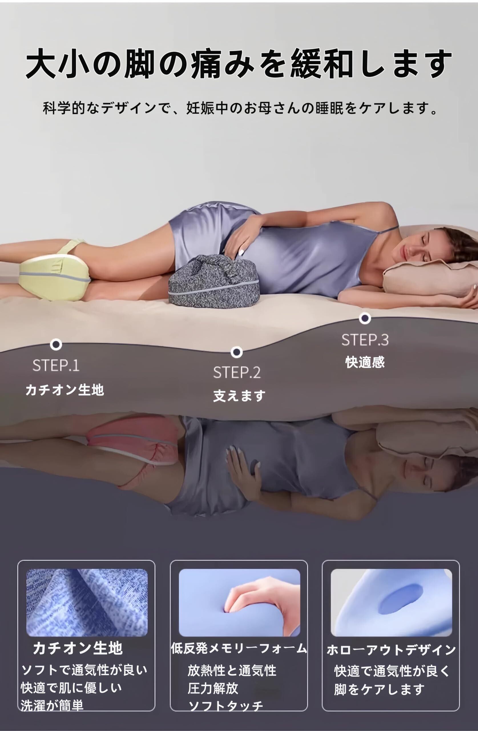 「足枕 膝枕」は、股関節痛や坐骨神経痛に悩む方に最適なアイテムです。特に妊娠中の女性や横向きで眠る方におすすめで、質の高い睡眠をサポートします。低反発素材の設計が、体圧を均等に分散し、理想的な姿勢を保ちます。