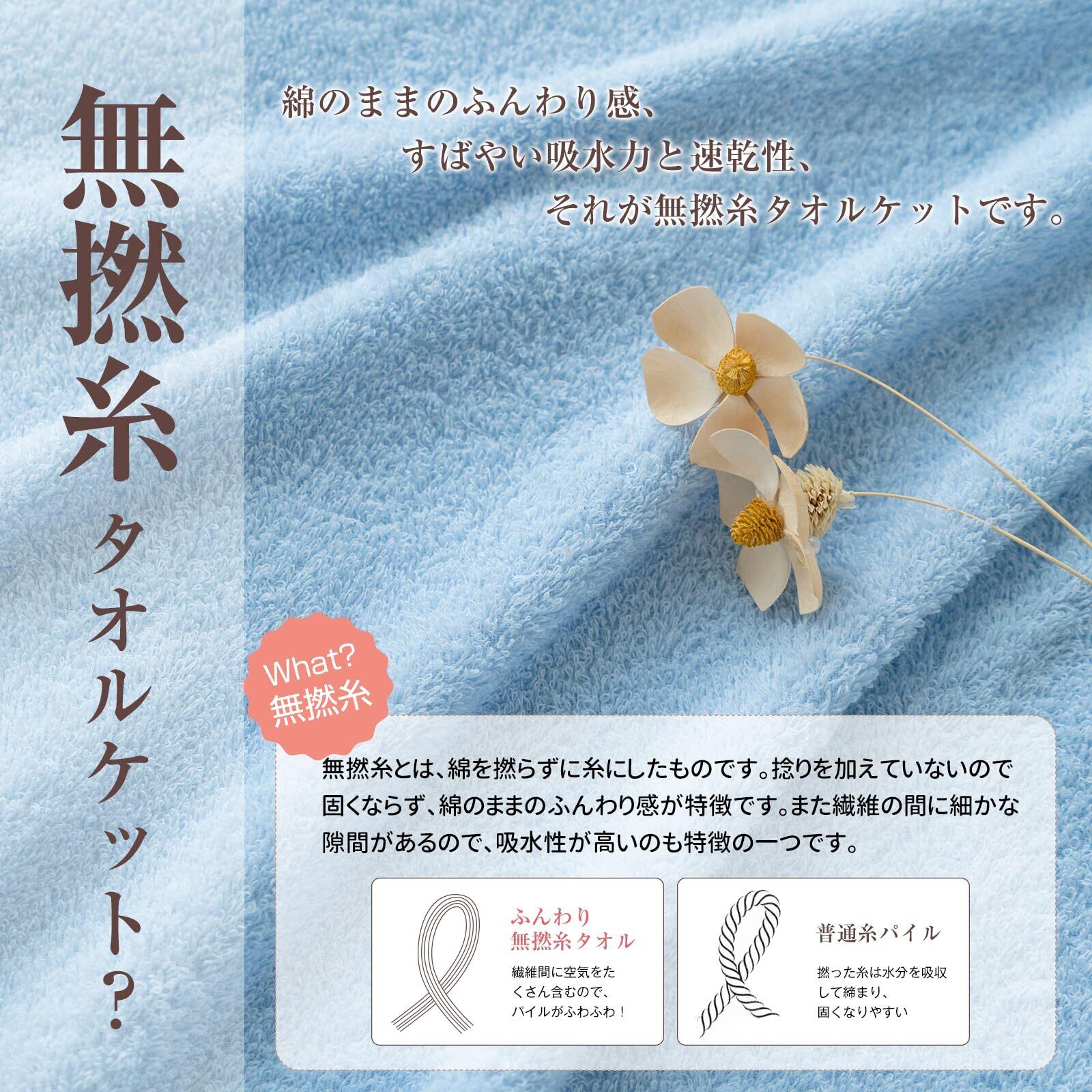 【抜群の吸湿通気性】無撚糸の吸水速乾性は普通のタオルケットの2倍になります。サッと拭くだけで肌に触れた瞬間から水滴をしっかりキャッチします。無撚糸は通気性にも優れており、乾きやすいのも魅力になります。汗をしっかり吸収し発散してくれるので、蒸し暑い季節でもお肌の快適さを保ちます。