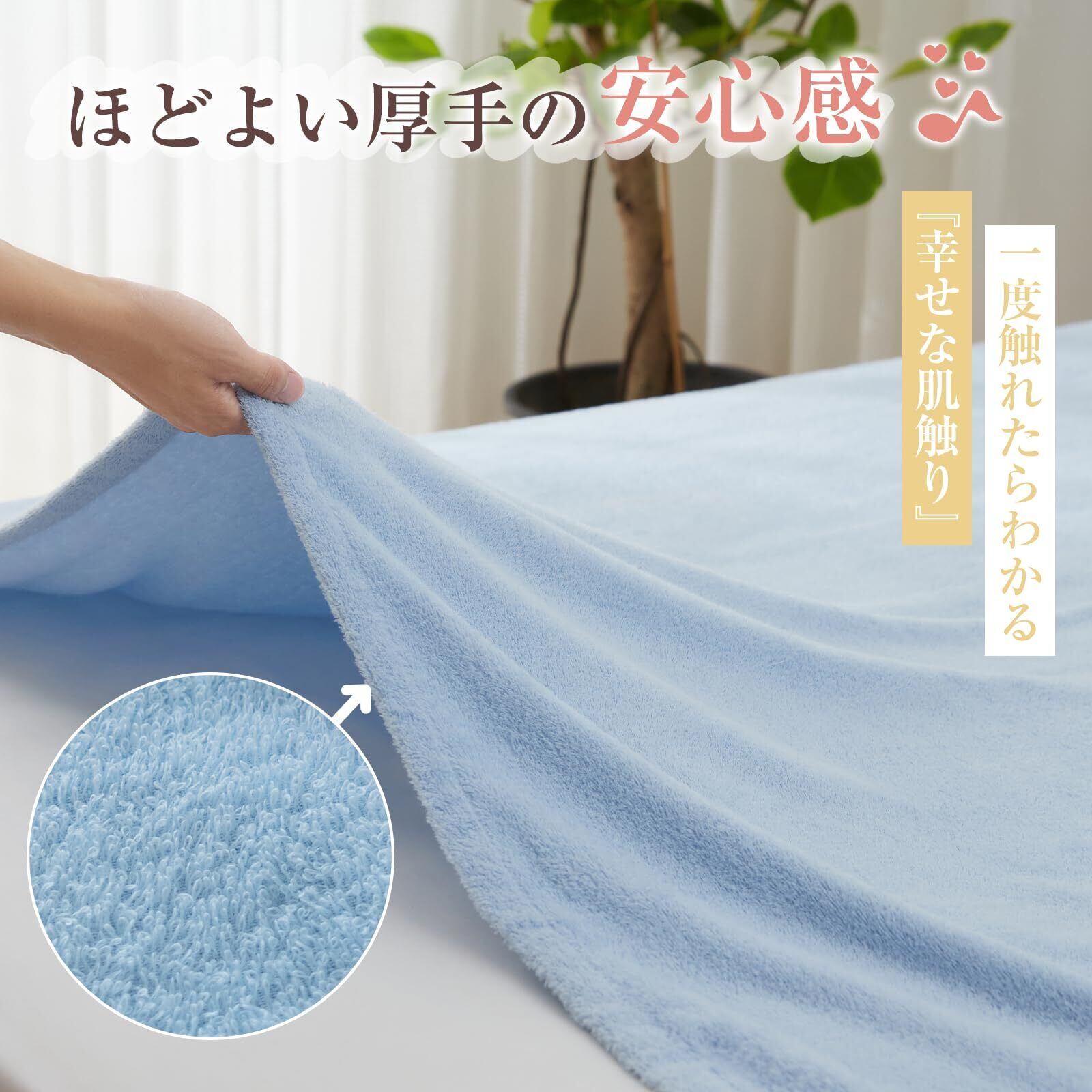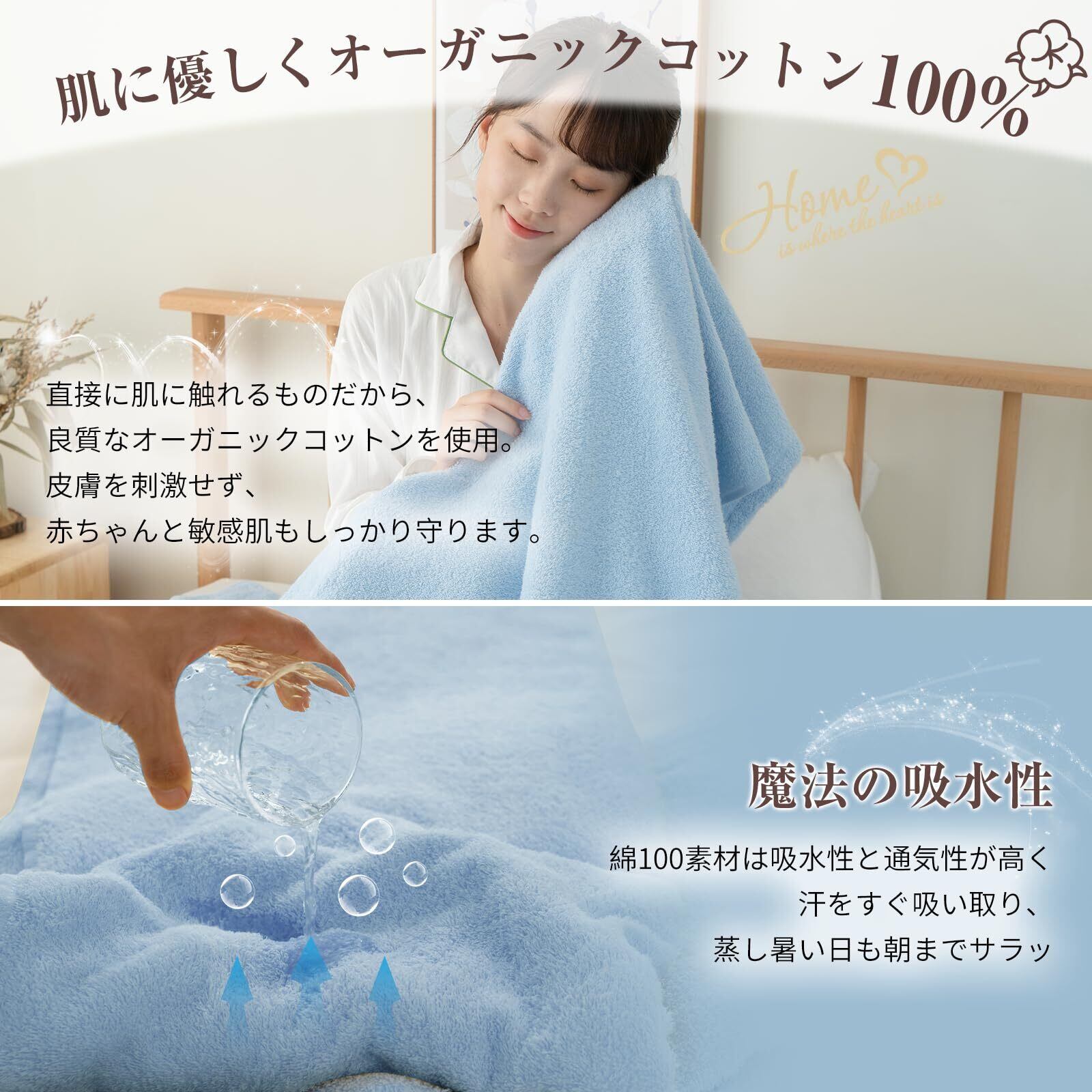 ■特徴: 綿100%、ふんわり無撚糸、オールシーズン使用可、抗菌防臭、防ダニ、速乾、丸洗いOK、140×190cm、ブルー