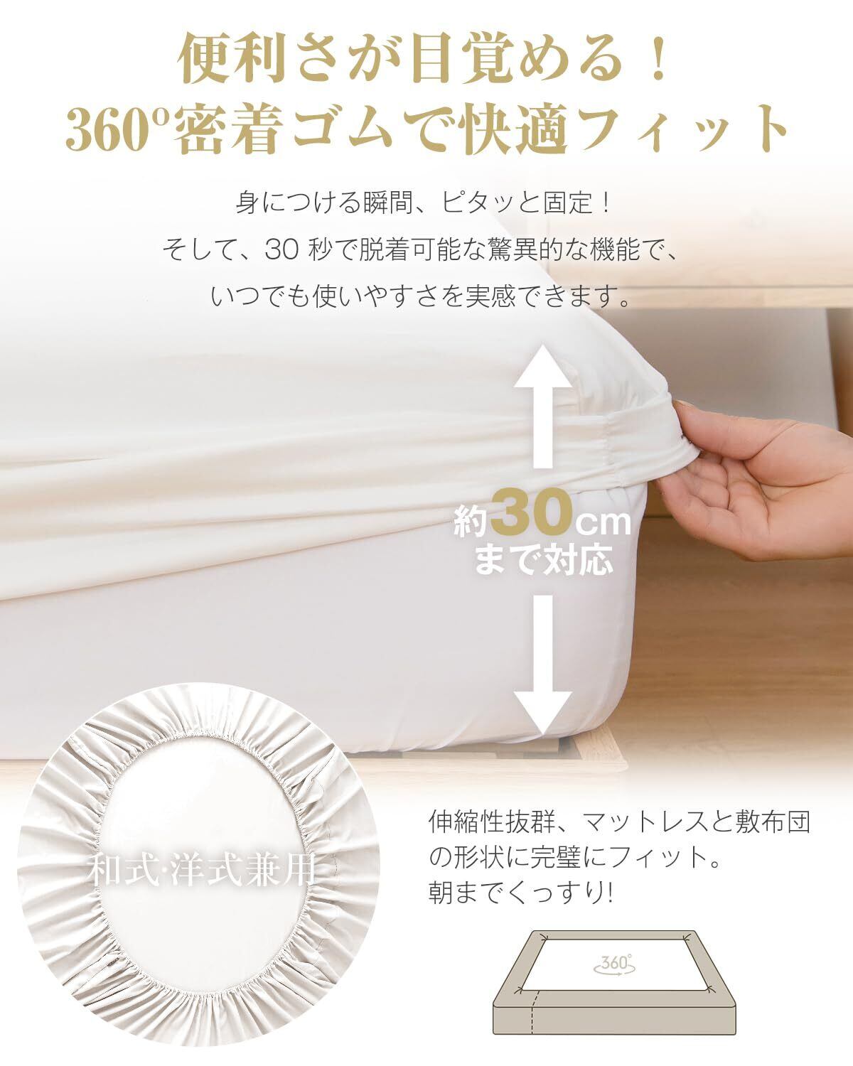 【30秒で簡単着脱!360°全周ゴム付きボックスシーツ】このベッドシーツは、伸縮性抜群の360°全周ゴムがマットレスや敷布団に完璧にフィットします。30cmほどの厚いマットレスでもしっかりと固定し、寝返りを打ってもシーツがずれるのを防ぎます。たった30秒で簡単に着脱できるので、忙しい朝でもラクラク!ベッドマットレス用としても敷布団用としてもお使いいただけ、洋式・和式を問わず、寝相が悪い方でも安心です。不快な隙間がなく、より一体感のある睡眠を実現します。