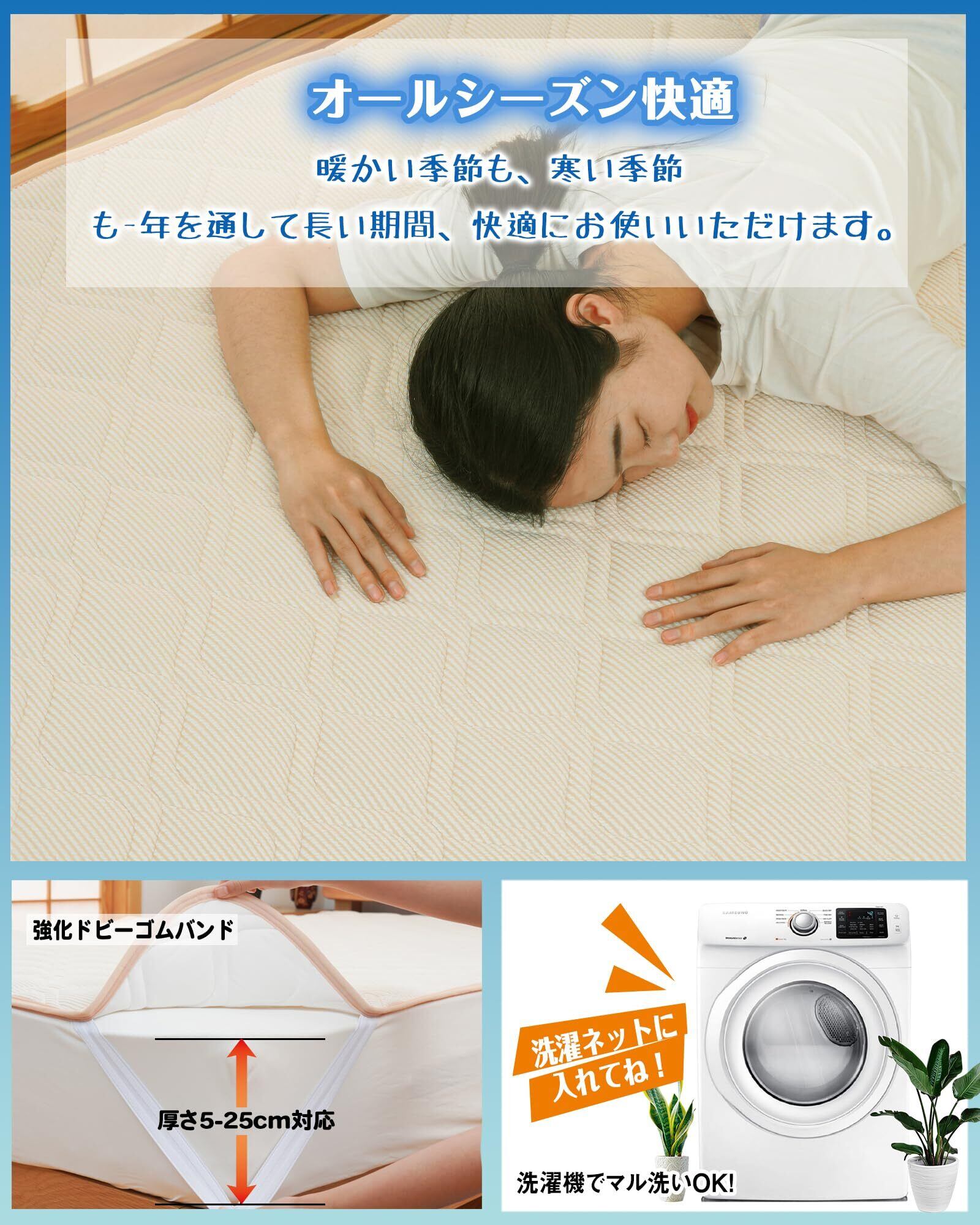 【透気性に優れた夏用】敷きパット肌に直接触れる部分には、天然素材のコットン100%に使用。表面はコーマ糸綿100%の織り糸で仕上げられ、その柔らかな質感が心地よい眠りを約束します。底部には吸湿速乾性に優れた異種構造糸を巧みに配し、快適な寝心地を提供します。最新の編み物の技術が採用され、布地の触感は非常に柔らかく、表面の微細な凹凸が、暑い日に汗をかいても、平織りの純綿生地のように身にくっつくことなく、涼やかな眠りを実現します。ベッドパッドはお客様の日常に上質な触感とスタイリッシュな快適さをお届けします。
