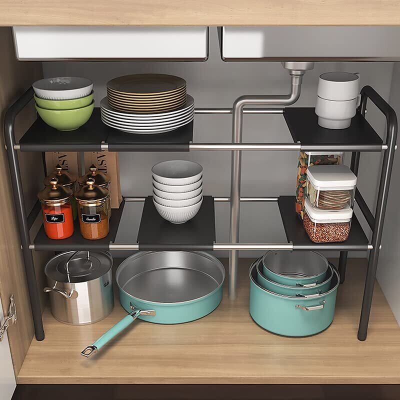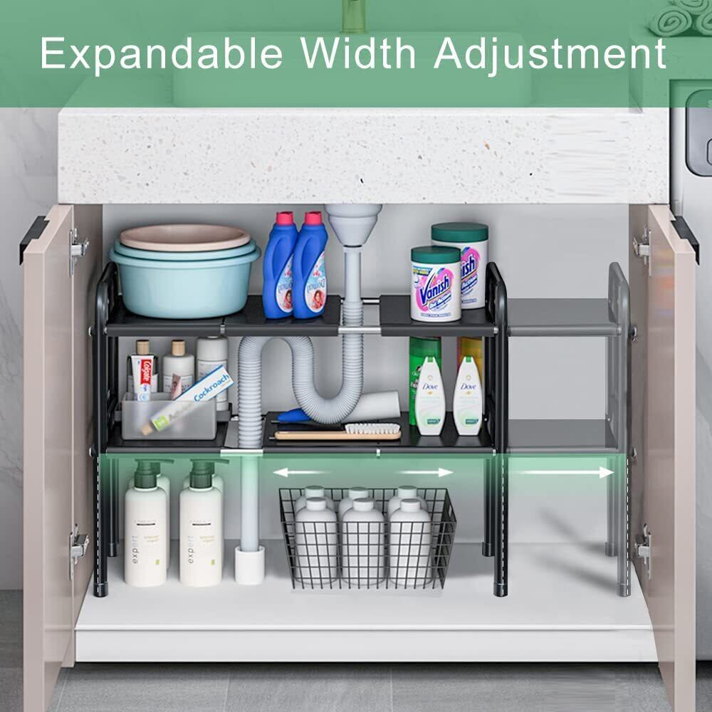 この収納ラックは、横幅を簡単に調整できる設計になっており、シンク下や洗面台下にフィットします。限られたスペースを最大限に活用できるので、各種ジャンルのアイテムを整理整頓するのに最適です。