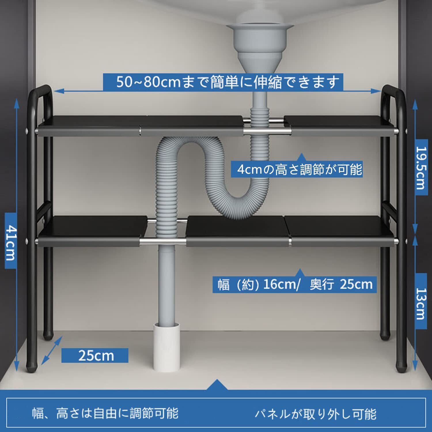 シンク下フリーラック キッチン シンク下 収納ラック ワイド 伸縮タイプ シンク下伸縮棚 キッチン収納棚 簡単組立 洗面台下収納ラック 横幅調整可能 (棚板6枚 2段)