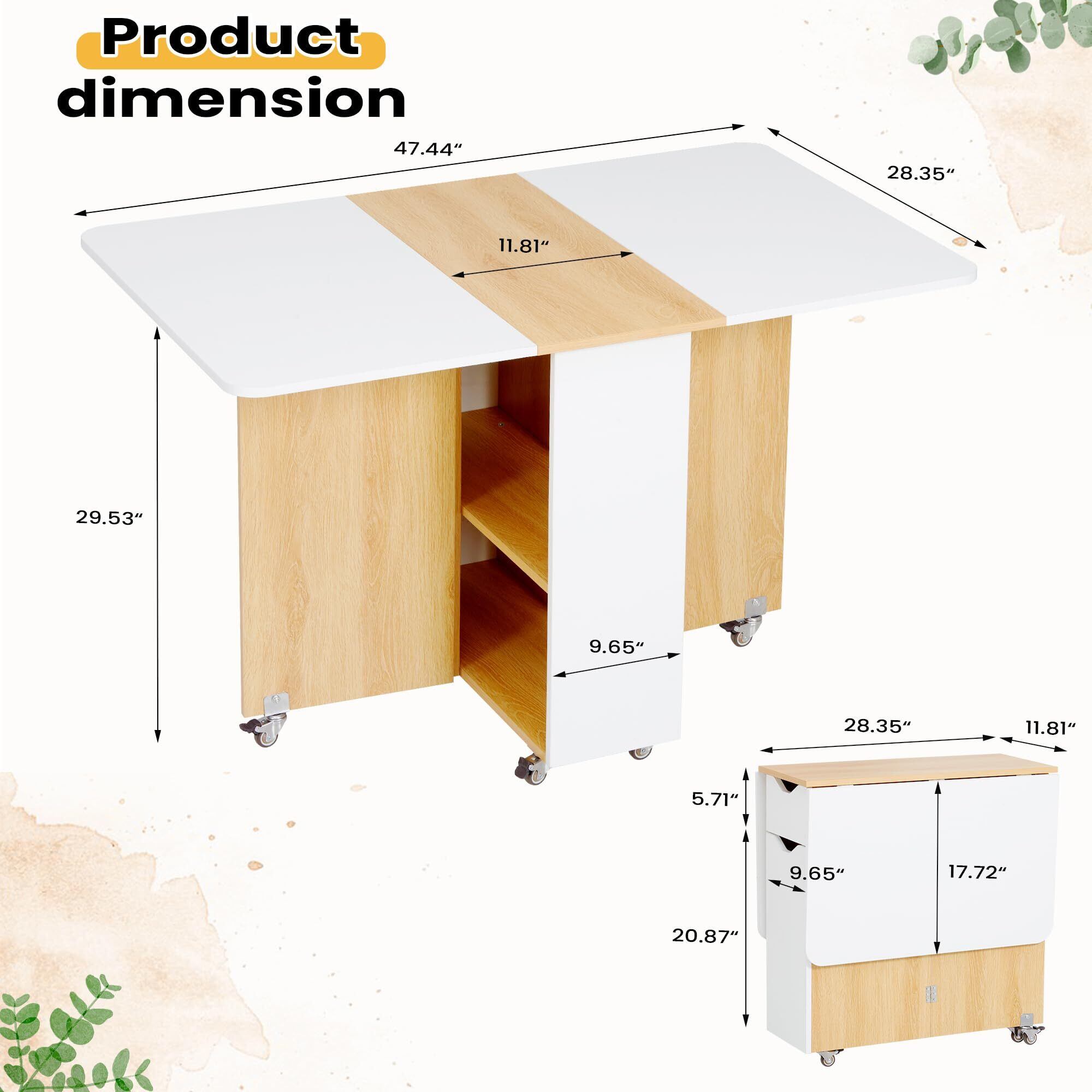 UPHYB 折りたたみ式ダイニングテーブル ドロップリーフダイニングテーブル ロック可能なキャスター付き 棚と引き出し付き 省スペース 拡張可能なディナーテーブル 収納付き キッチンテーブル 狭いスペース用 (ホワイトブラウン)