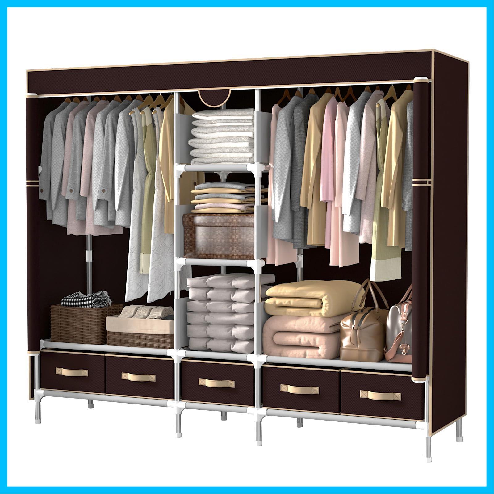 ワードローブ 引き出し5つ付き 大容量 収納 クローゼット おしゃれ 不織布 簡単組立式 ハンガーラック 収納棚 防水 防塵 防汚(185×奥行45×高さ170cm) (ダークブラウン)