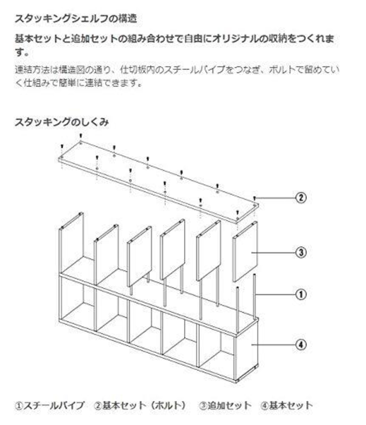 スタッキングシェルフ専用の便利なオプションパーツです。組み合わせて使えば、より機能性がアップします。コの字棚の脚部を内側へ軽く押しながら入れていただくと、傷が付かずに設置できます。※側面の一か所に製造工程上必要な穴が開いていますが、使用上問題はございません。