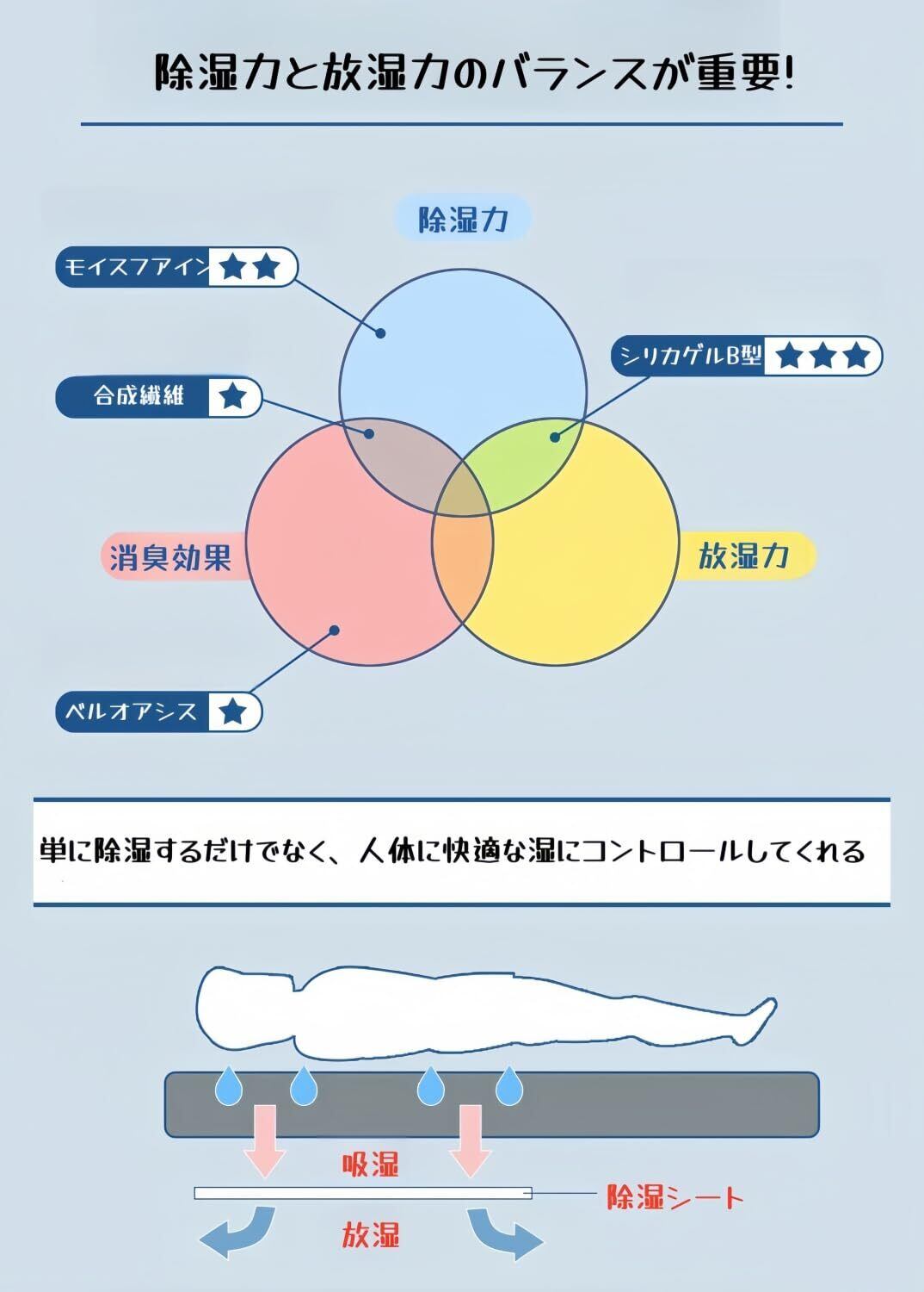【消臭・防カビ・防ダニ効果で快適に】ジメジメ知らずで睡眠環境を整えてくれる、強力な除湿(乾燥)効果でダニを寄せ付けにくく、カビの発生を抑え、敷き布団やベッドを清潔に保ちます。さらに、いやなにおいの原因となる汗臭・アンモニア臭・加齢臭も吸収し、睡眠環境を整えてくれます。