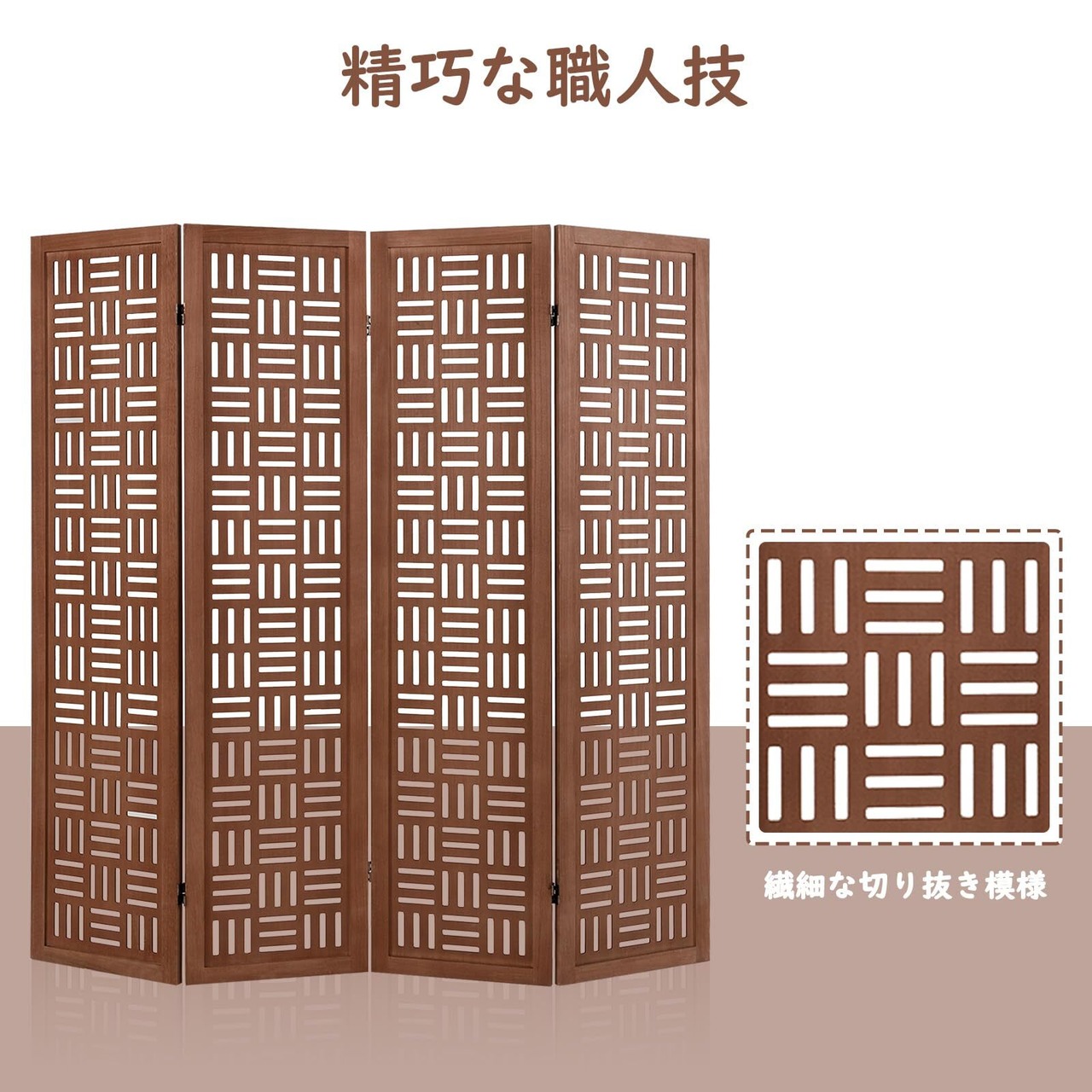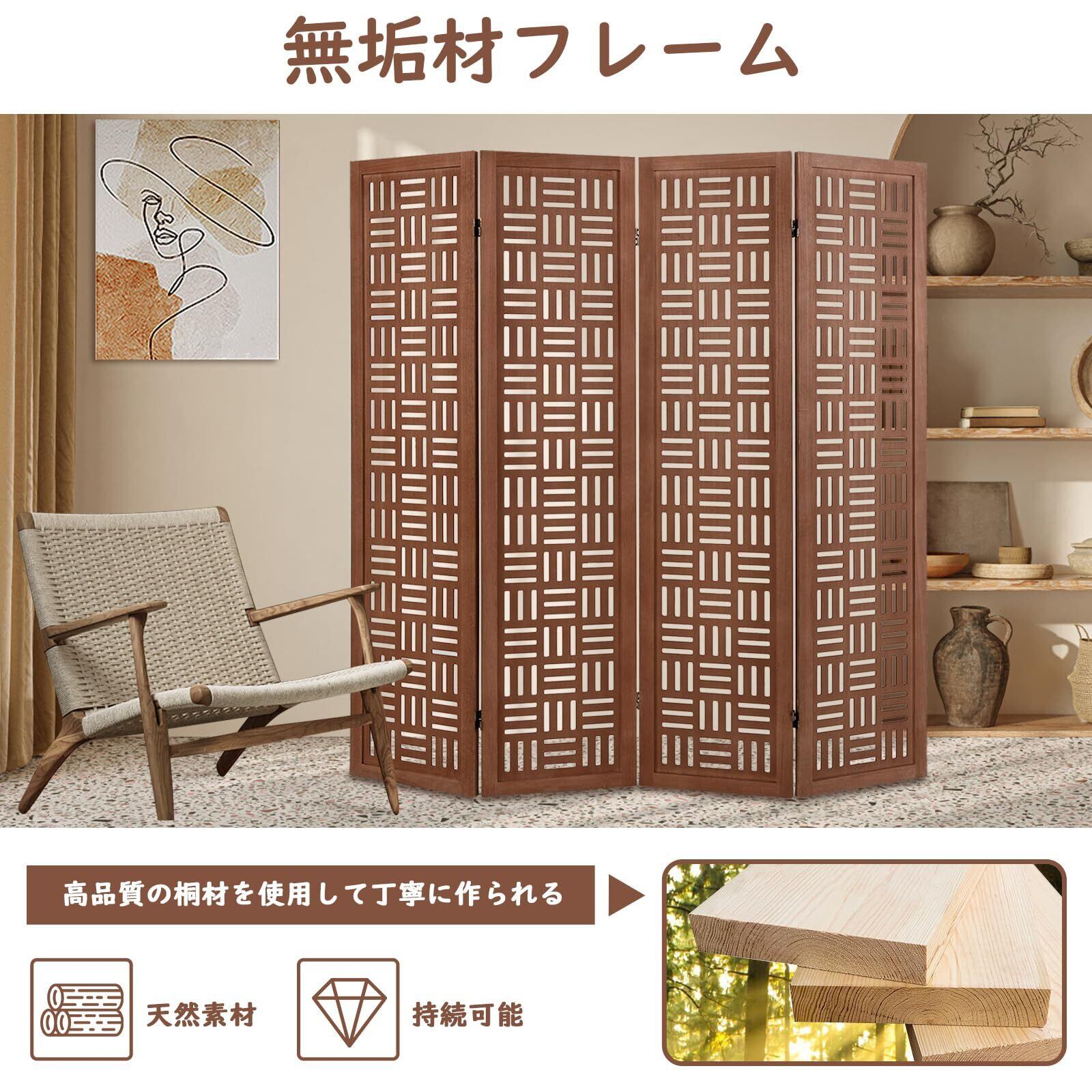 【数量限定】COSTWAY パーテーション 間仕切り 4連 和風 高さ165cm 幅160cm 組立不要 ついたて 目隠し 室内 おしゃれ 折りたたみ 天然木 屏風 衝立 区切り コンパクト収納 オフィス 事務所 クリニック ダークブラウン (4連-和風-幅160cm)