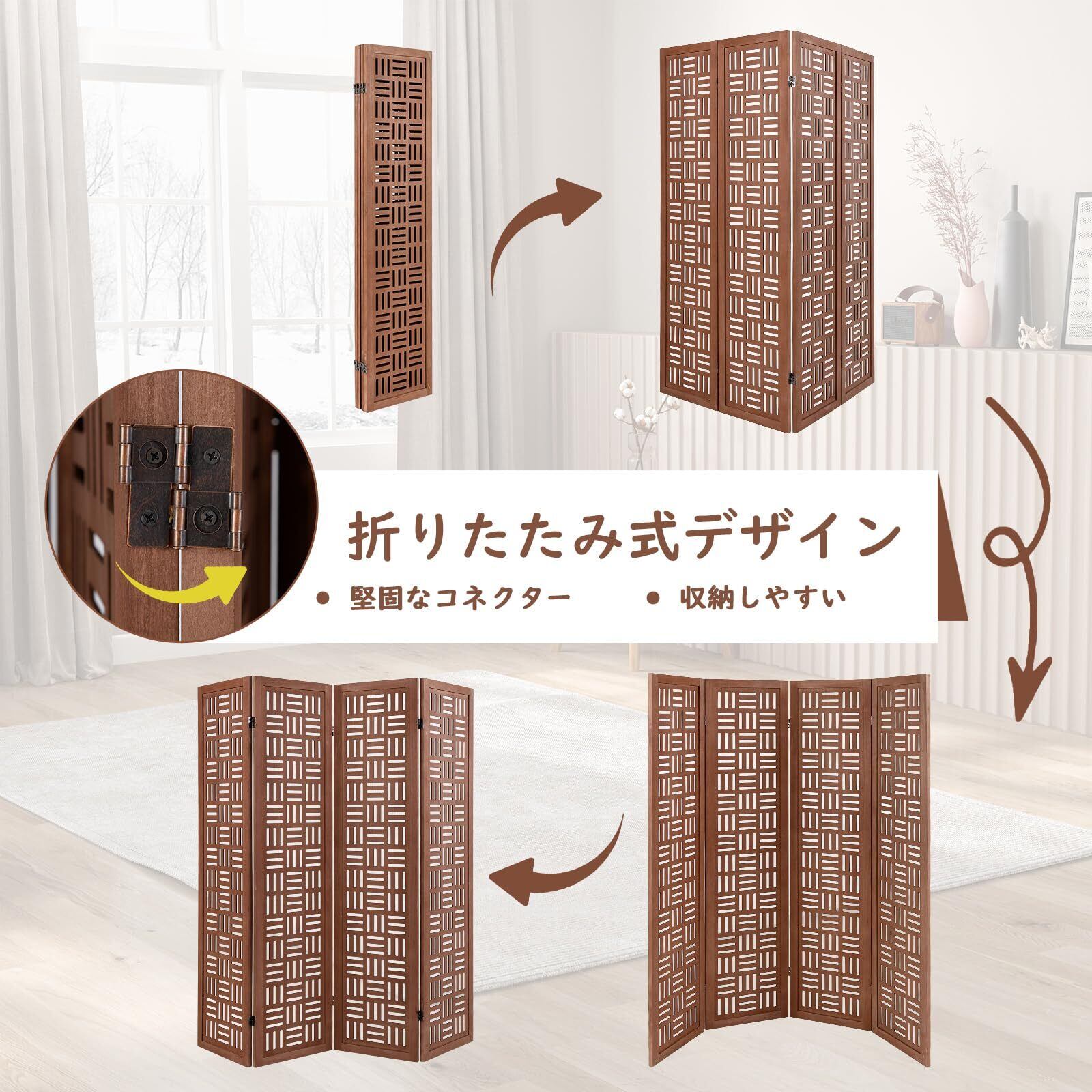 「COSTWAY パーテーション」は、美しい和風デザインで、あなたの室内をスタイリッシュに演出します。高さ165cm、幅160cmの4連タイプで、リビングやオフィス、クリニックなどさまざまなシーンで活躍します。組立不要で、簡単に設置できるのも嬉しいポイントです。