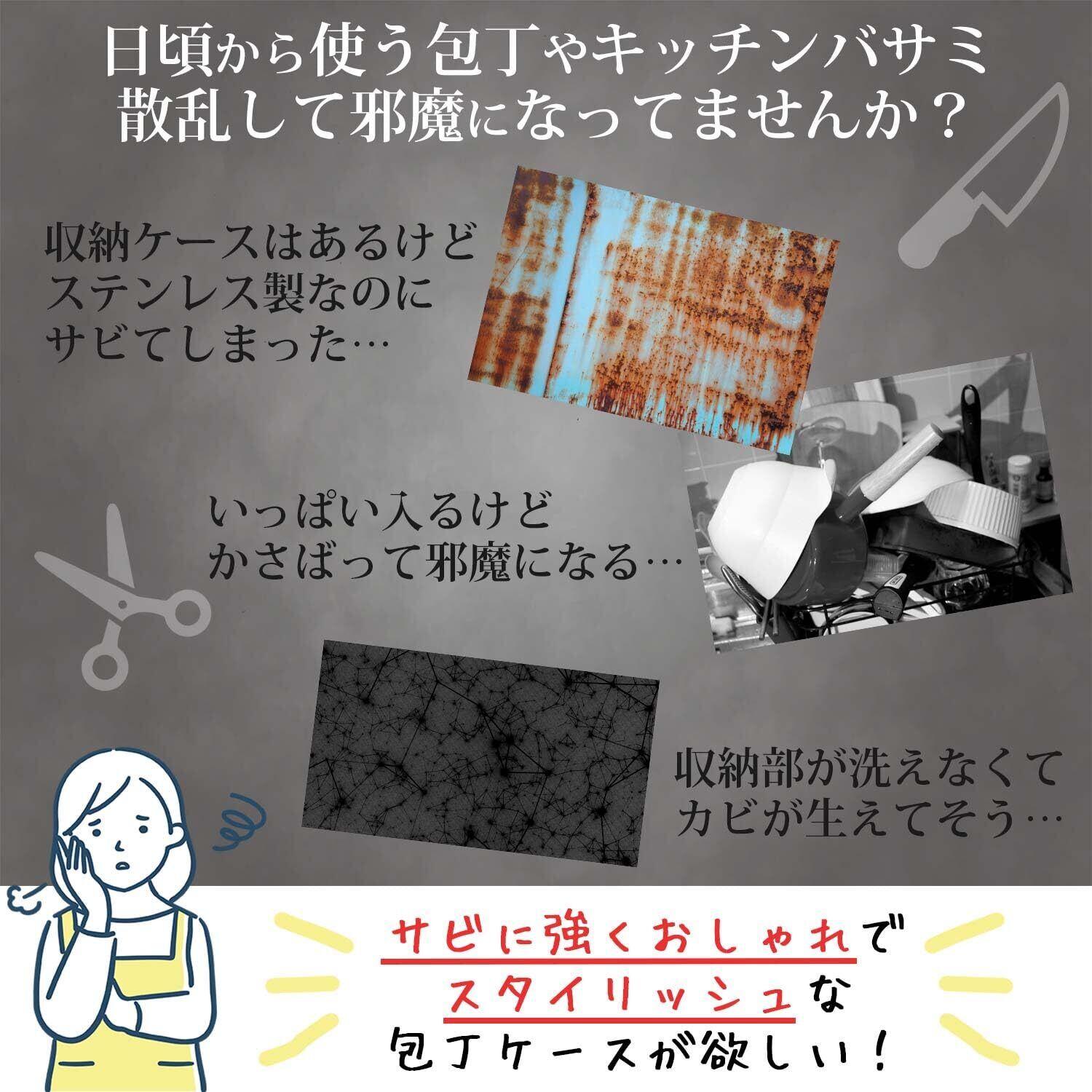 【サビに強くおしゃれでスタイリッシュな包丁ケースが欲しい!】日頃から使う包丁やキッチンバサミ、散乱して邪魔になってませんか?収納ケースはあるけどステンレス製なのにサビてしまった・・・、いっぱい入るけどかさばって邪魔になる・・・、収納部が洗えなくてカビが生えてそう・・・