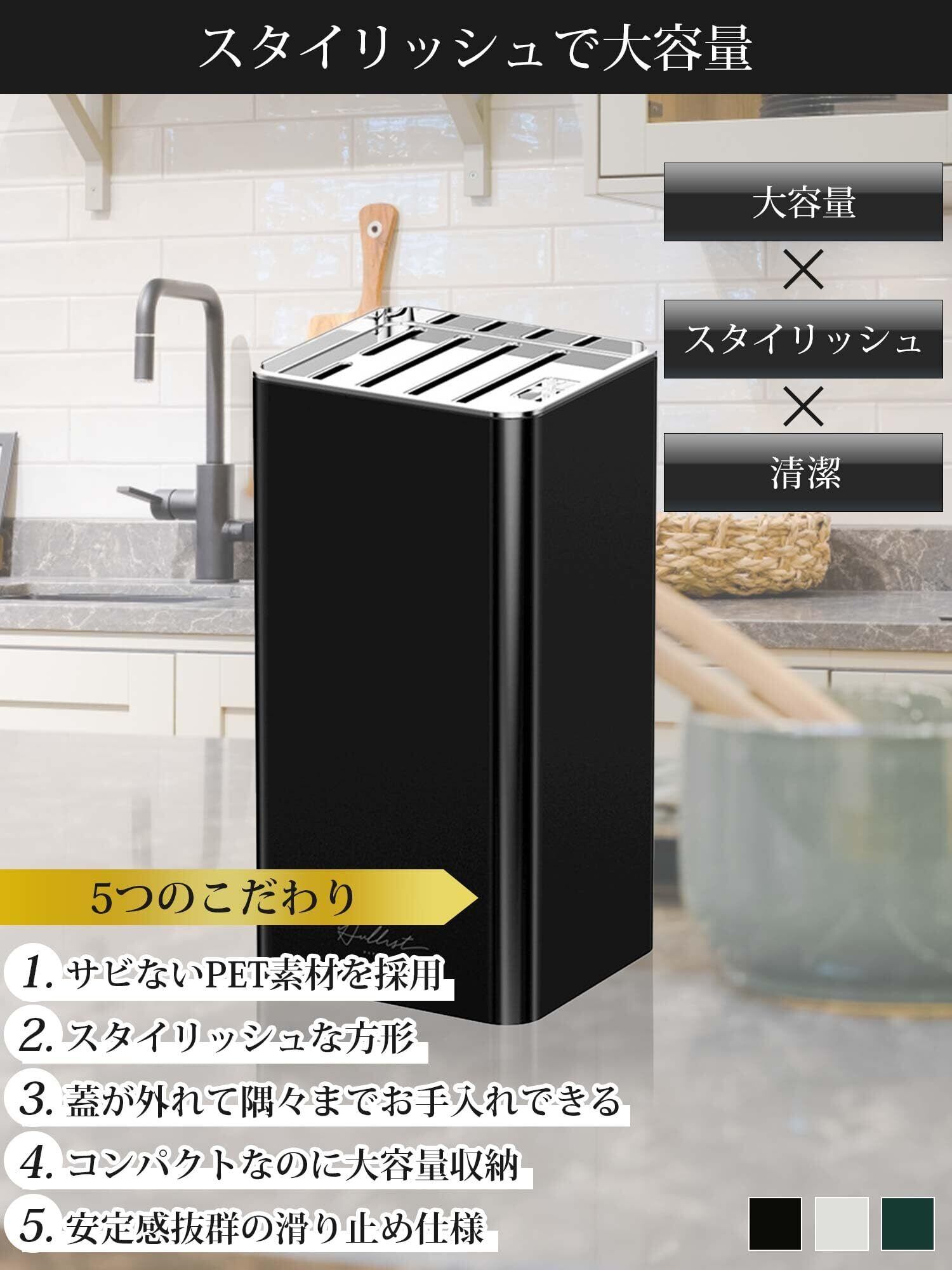【製品仕様】サイズ:高さ23.5cm×縦12.0cm×横11.0cm、重量:約400g、カラー:ブラック・ホワイト・ダークグリーン、材質:【本体】PET 【フタ】ABS+メッキ処理 【滑り止め】シリコン、収納本数:包丁5本前後、キッチンバサミ1本 ※刃先サイズ、柄の太さにより異なります。