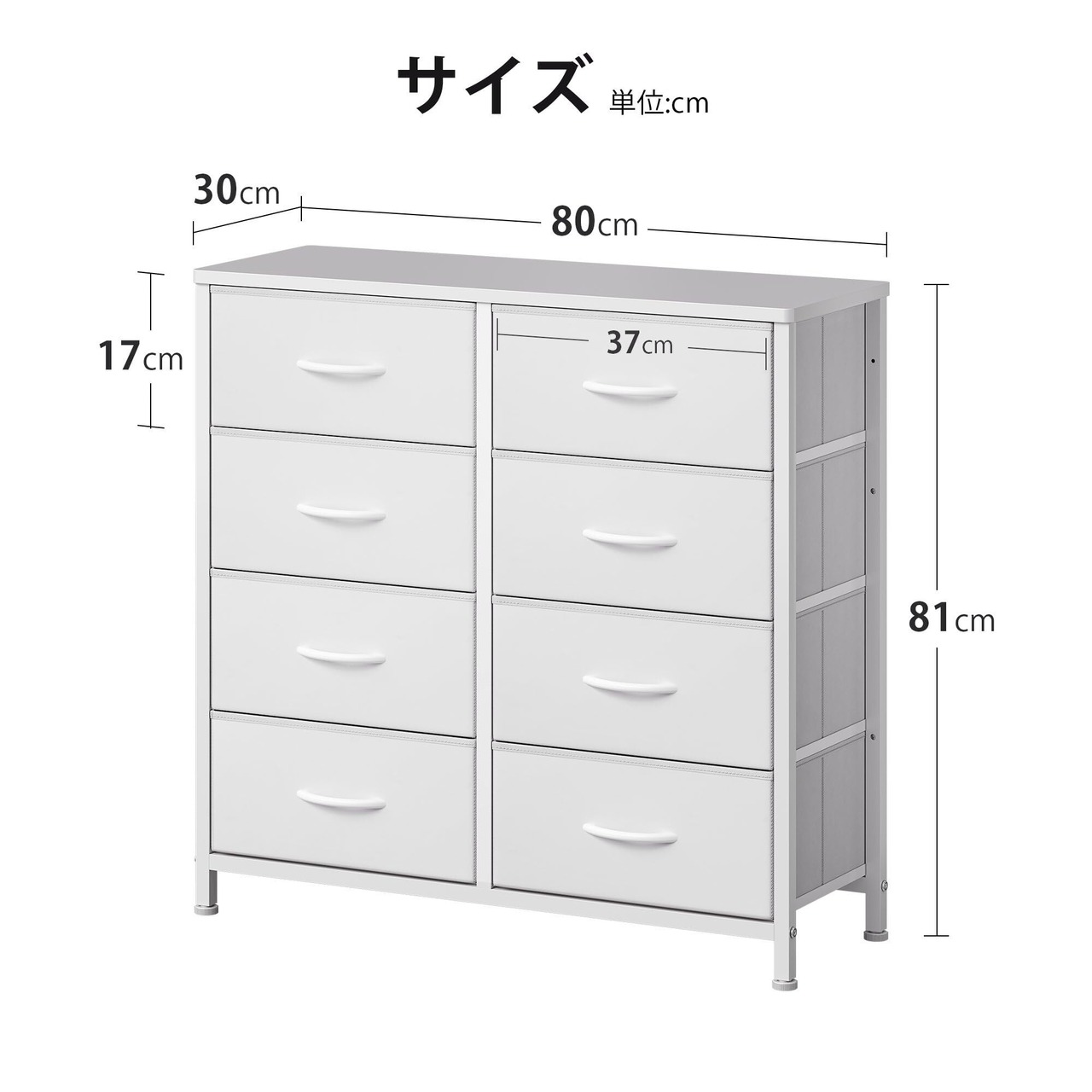 【商品仕様】 ■ファブリックチェスト本体サイズ:幅80奥行30高さ81cm ;重さ:9.85kg ■天板材質:MDF(E1級合成樹脂強化板) ;耐荷重:30kg ■引き出し生地:オクスフォードとMDF ■取っ手材質:天然木 ■フレーム材質:15mmのスチール