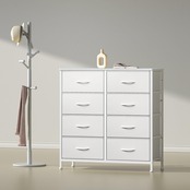 このチェストは、木製の天板とスチールフレームを採用し、頑丈さと安定感を兼ね備えています。布製の引き出しは、季節ごとの衣類や小物をたっぷり収納することができ、引き出しを引く際もスムーズです。組み立ても簡単なので、手軽にあなたの収納スペースを整えることができます。