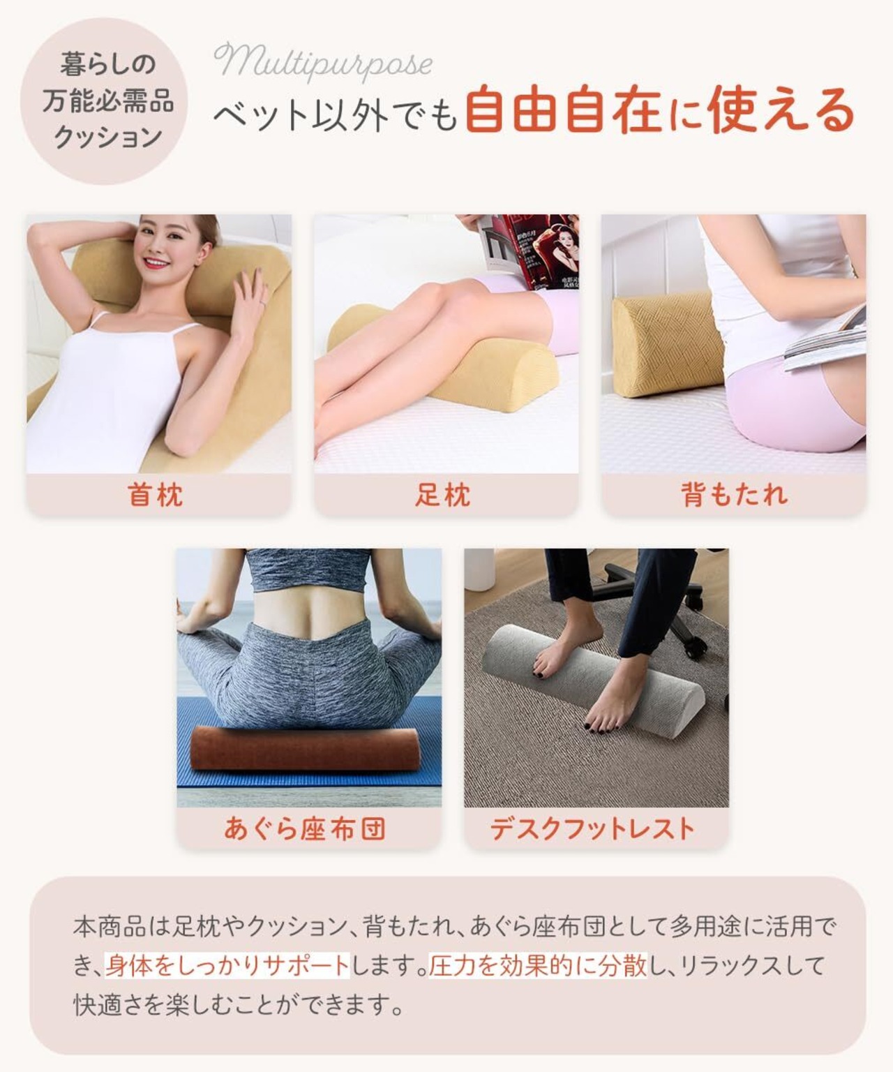 ️【自由自在に使える万能クッション】このクッションは、スタイリッシュで美しいハーフムーン形状が特徴です。足枕やクッション、背もたれ、あぐら座布団として多用途に活用でき、身体をしっかりサポートします。圧力を効果的に分散し、リラックスして快適さを楽しむことができます。