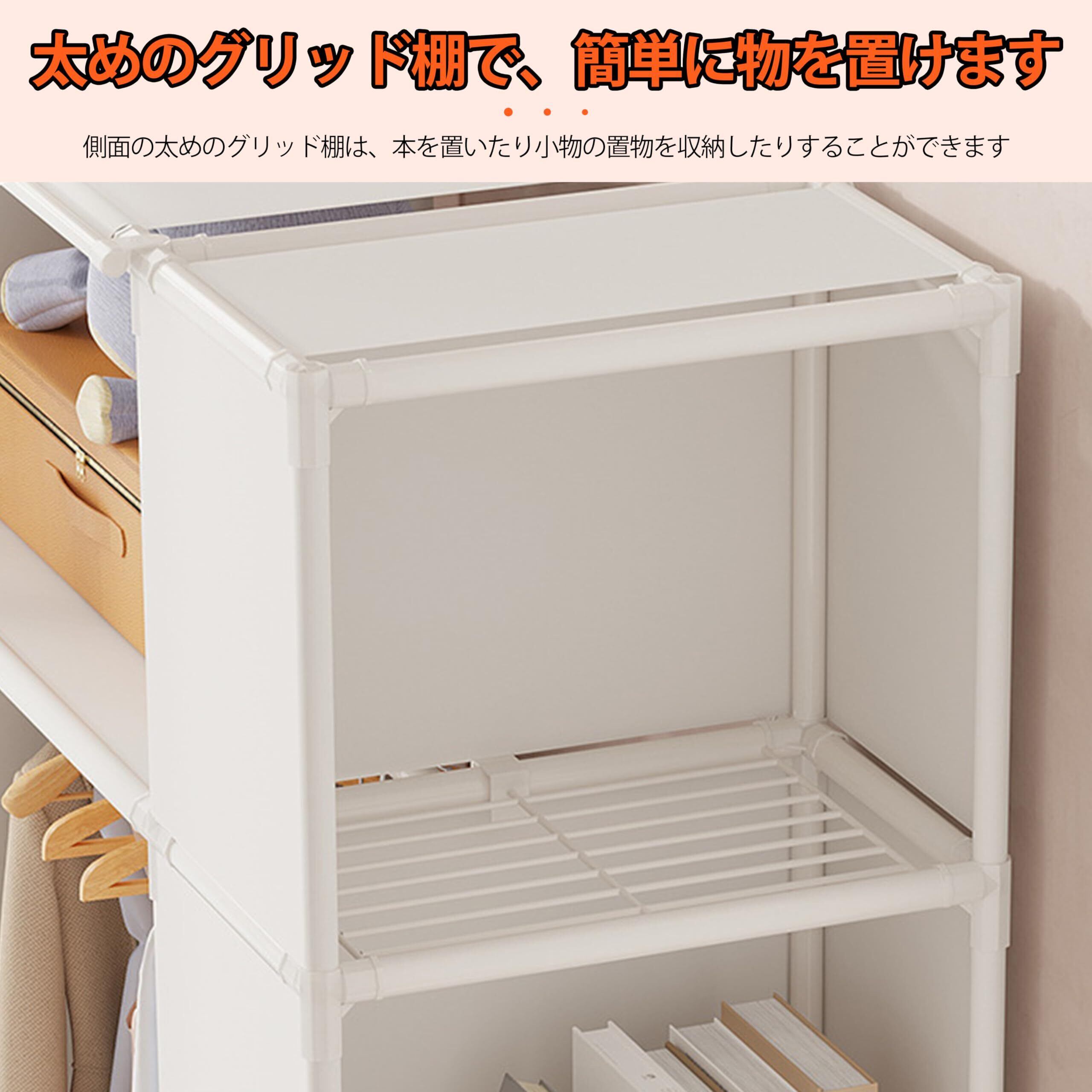 【分類収納設計】ワードローブは 細部までこだわった仕切りで立体的な収納システムを実現しています。ワードローブ ハンギングエリアは、様々な吊り下げ式衣類の整理整頓に役立ちます。オープントップの棚は 枕 ハンドバッグ おもちゃなどの小物を柔軟に収納できます。大胆なオープンサイドグリッドデザインは 靴下 下着 その他の日用品の収納に最適です。Xozilo クローゼット すべてのアイテムに適切な場所があり 整理整頓され 取り出しやすくなっています。