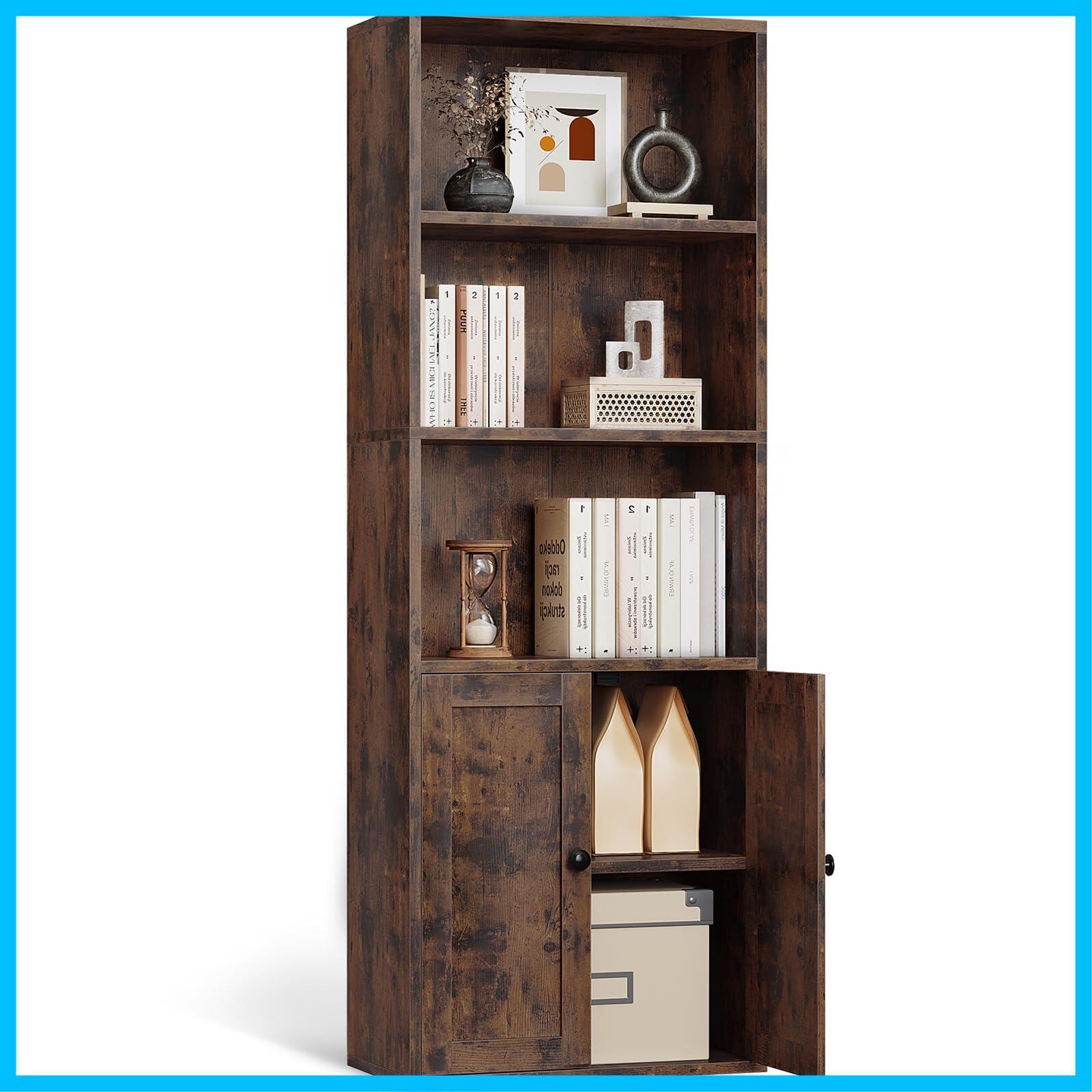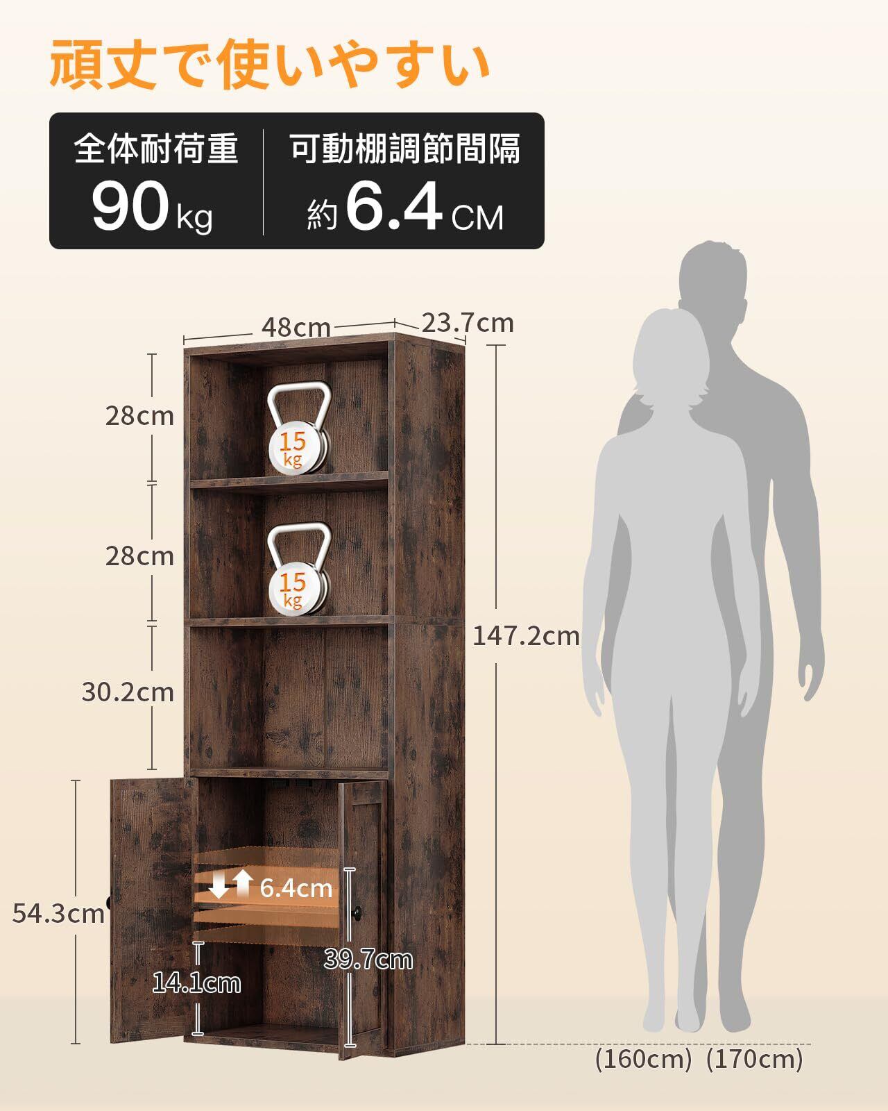 AODK 本棚 大容量 オープンシェルフ 5段 棚 スリム 収納ラック 幅48cm 扉付き おしゃれ 組立品 工具別途要 ビンテージ