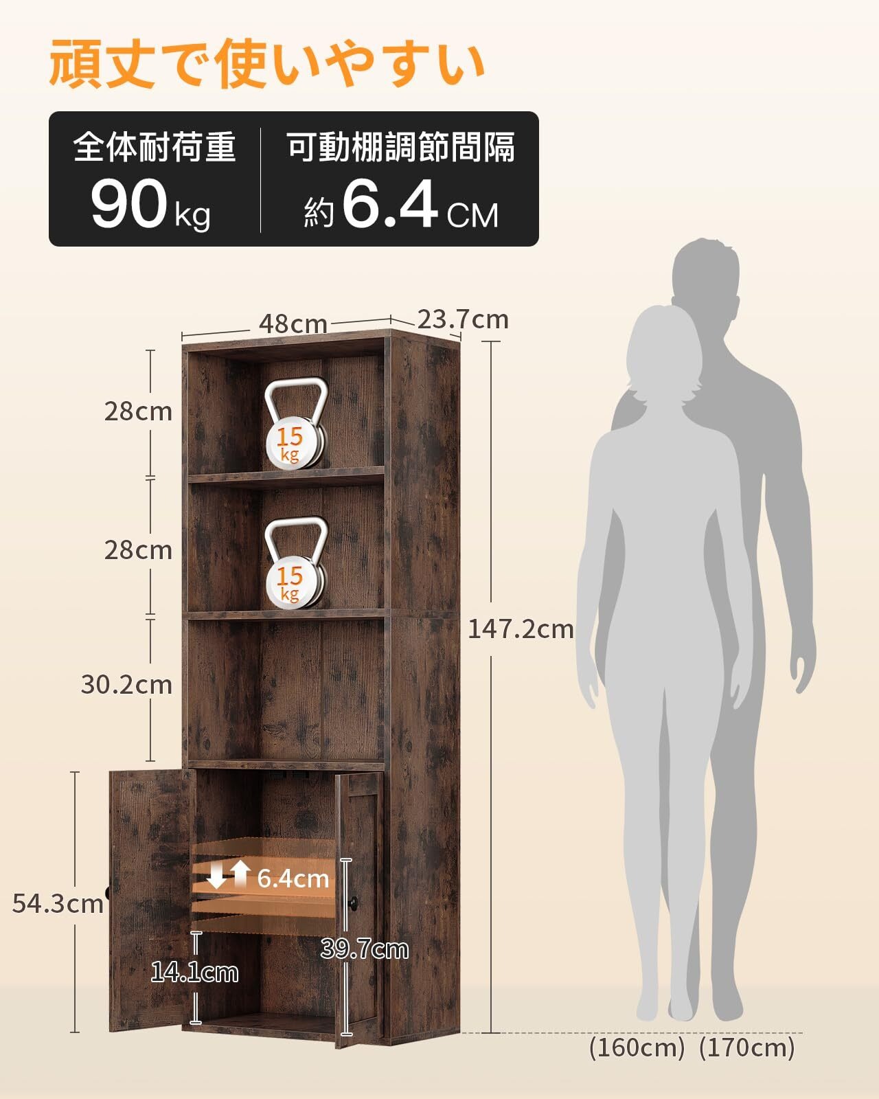 【商品仕様】本体サイズ:幅48×奥行23.7×高さ147.2cm。本体重量:13.5KG。耐荷重:棚板は1枚あたり15キロで、製品全体は90キロです。 | 日本語組立説明書あり | お客様組立品で、プラスドライバーは別途ご準備ください。部品ごとに番号シールが付いており、手順に従って順調に組み立てられます。万が一ご購入いただいた商品に初期不良などが発生した場合、お気軽にお問い合わせください。