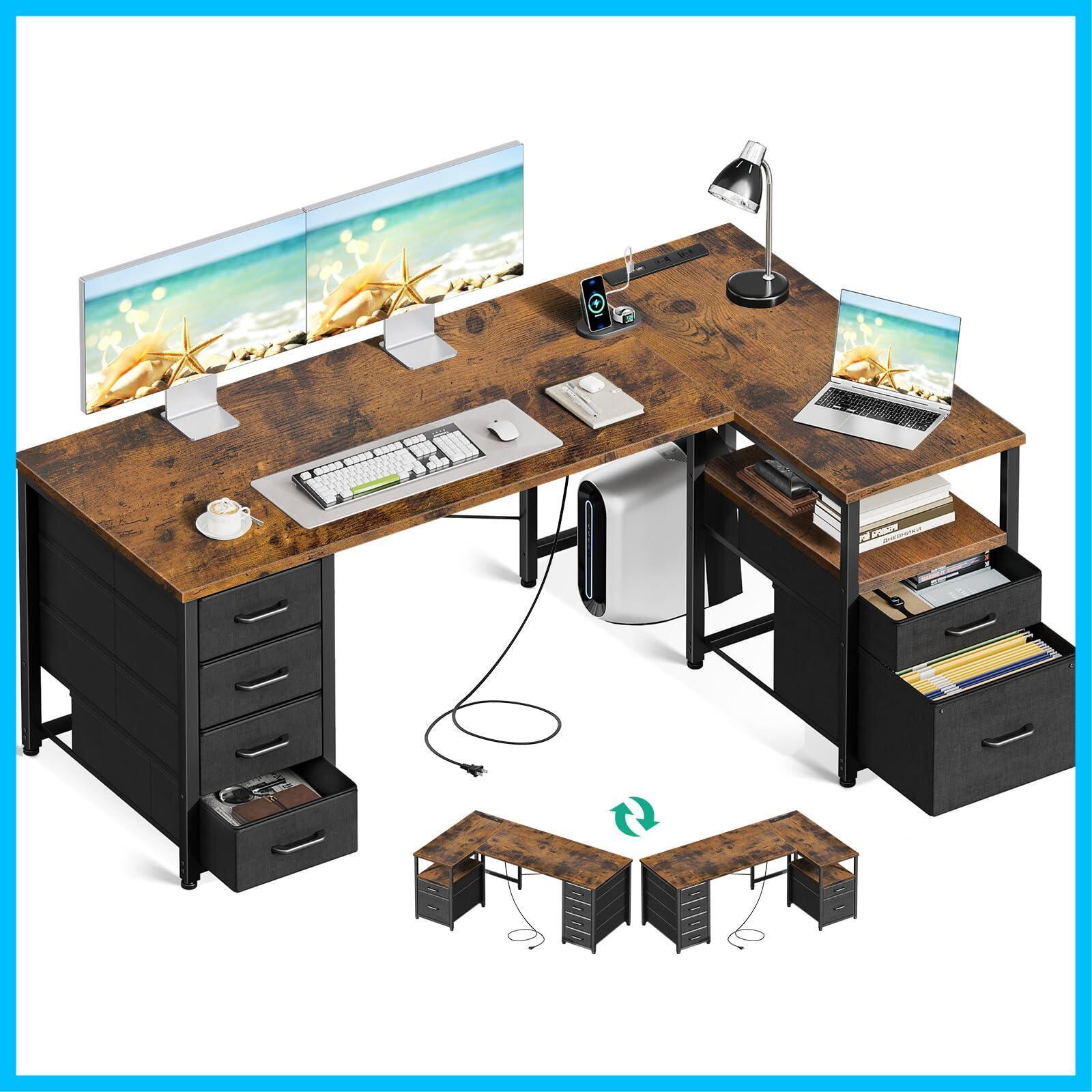 AODK パソコンデスク 引き出し6杯付き ゲーミングデスク コンセント付き l字デスク デスク 机 幅140 pcデスク 棚付き desk 収納 ワーク オフィスデスク 在宅勤務 仕事用 組立簡単 ビンテージ