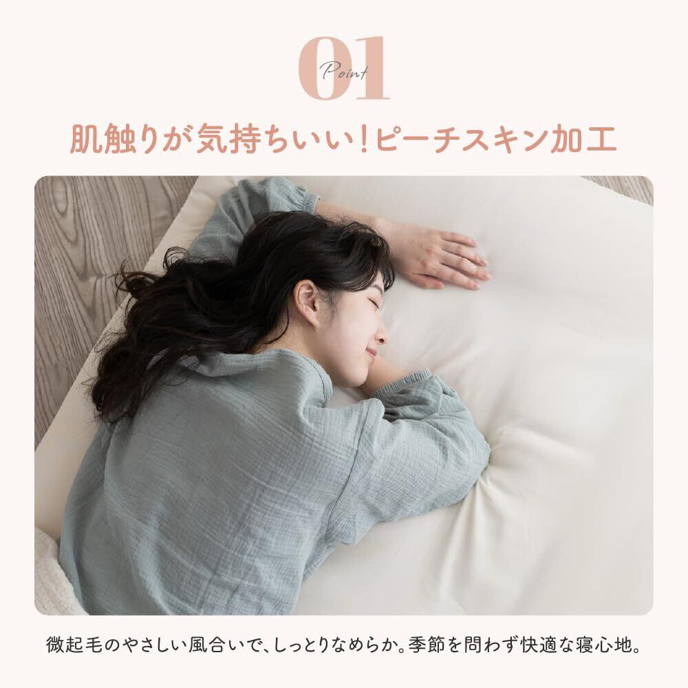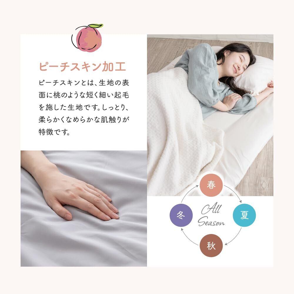 【とろけるような肌ざわり:ピーチスキン加工】微起毛による、まるで桃の肌のようなしっとりとなめらかな風合い。季節を問わず、一年中気持ちよく眠れます。お肌が敏感な方にも優しい、心地よい肌触り。