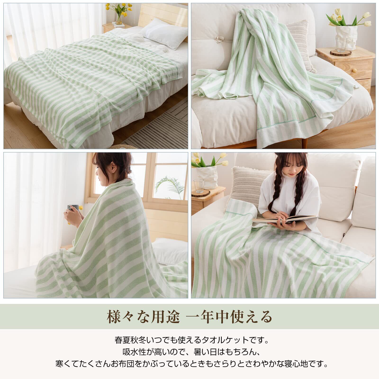 【オールシーズン・様々な用途】肌掛けのコットン素材なので、一年中お使いいただけます。汗ばむ季節は吸水性があるのでサラッと快適で、冷房の効いた部屋での毛布としてもお使いいただけます。肌寒い季節はパイルが程よく空気を含んであたたかく、毛布の代わりに布団のインナーとしても使えます。また、シーツとしても適しています。 ホームだけでなく、温泉・旅行・お花見などいろいろなシーンで大活躍します。自分が使うだけではなく、同僚、上司、お客様へのお礼、友達祝い、親孝行、祝日のギフトにもおすすめです。