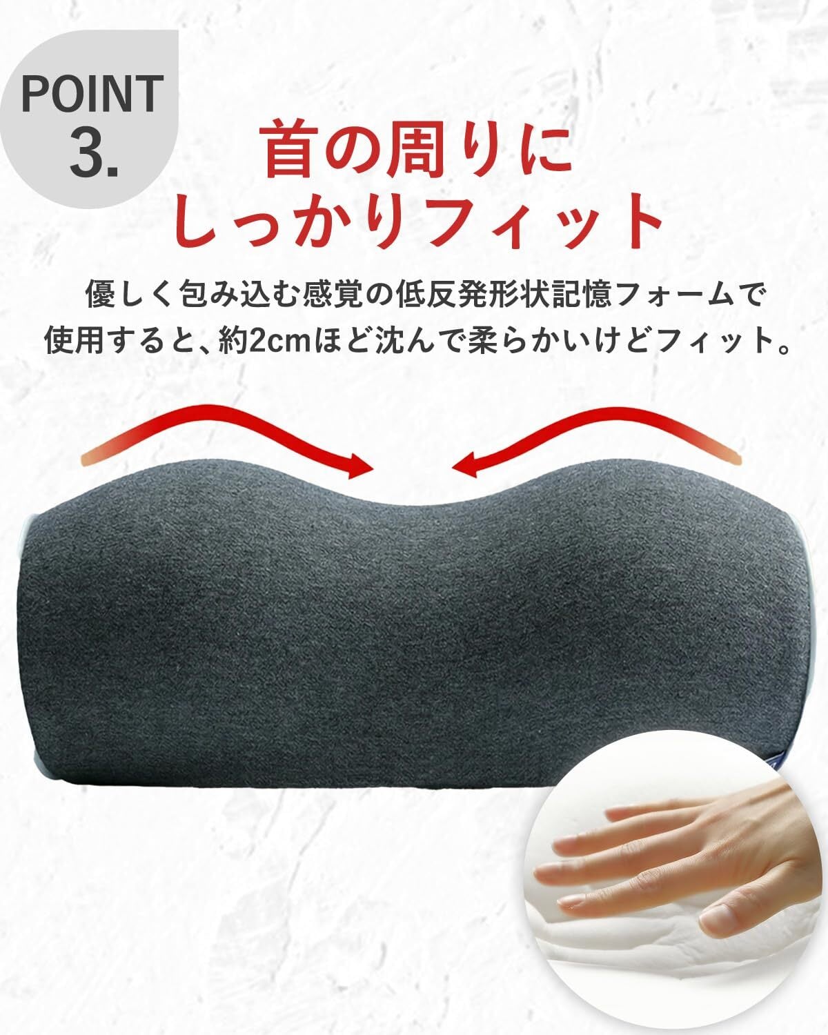 【包み込むようなサポート力】 約2cm沈む絶妙な柔らかさの形状記憶フォームが、首のラインにしっかり密着。優しく包み込みながらも安定感のあるサポートで、就寝時にも安心して使用できます。