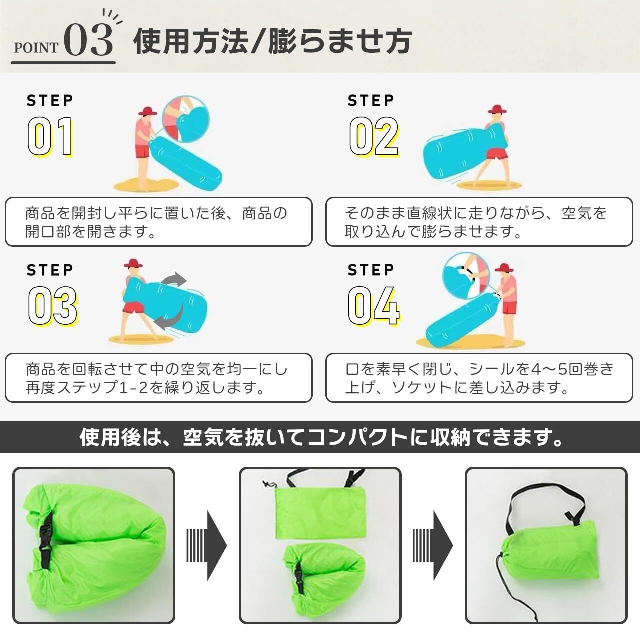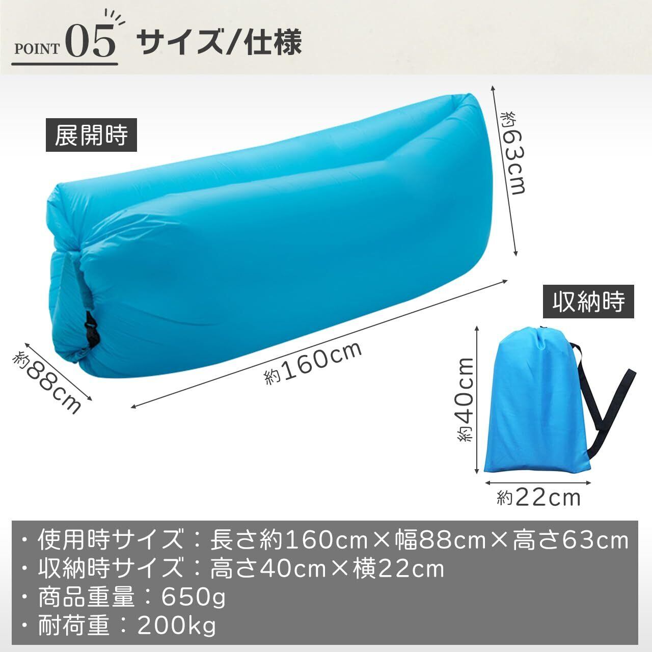 【商品説明】エアソファは、アウトドアやインドアで使える便利なアイテムです。収納袋付でコンパクトに収納でき、持ち運びに便利です。空気入れ不要で、どこでも簡単に設置できます。