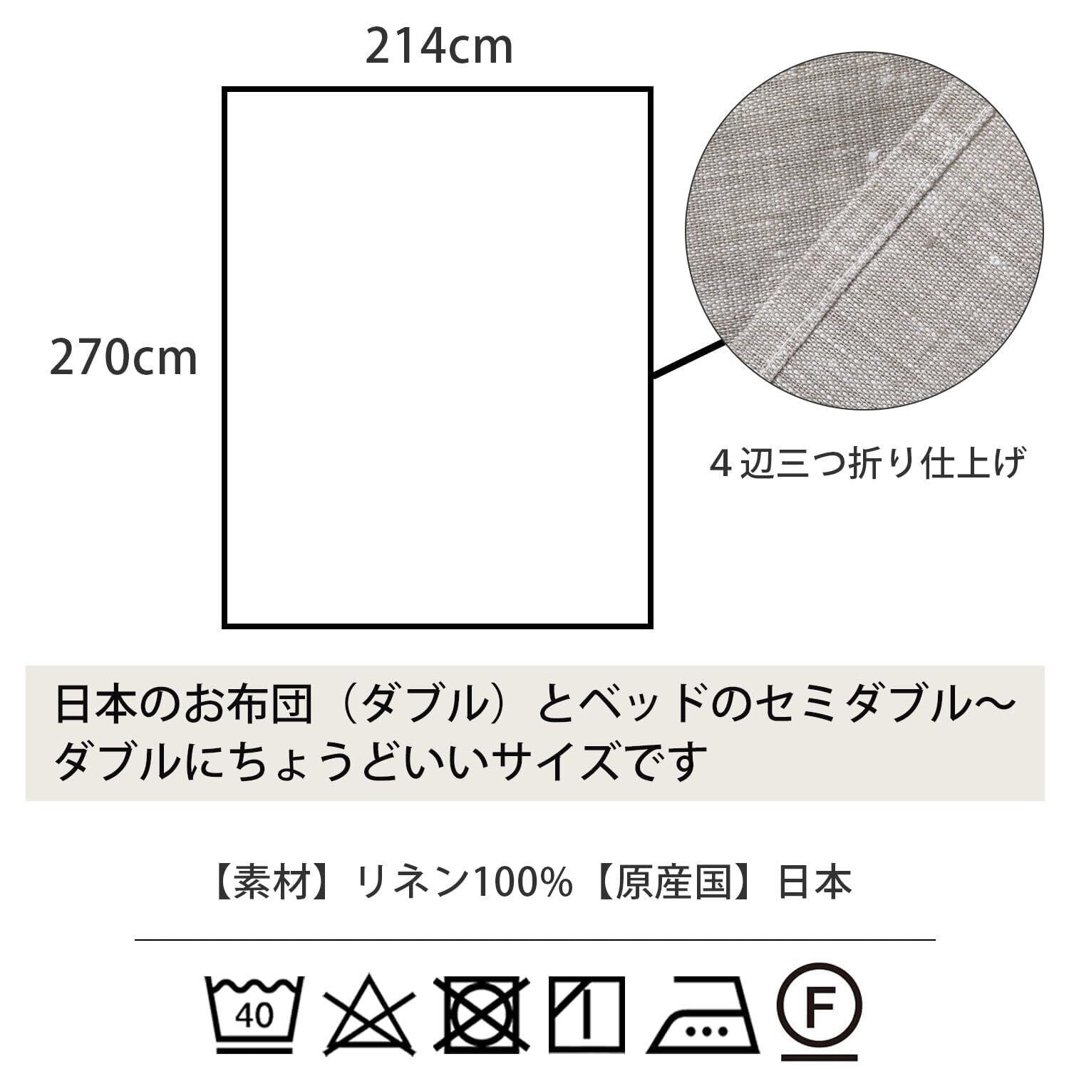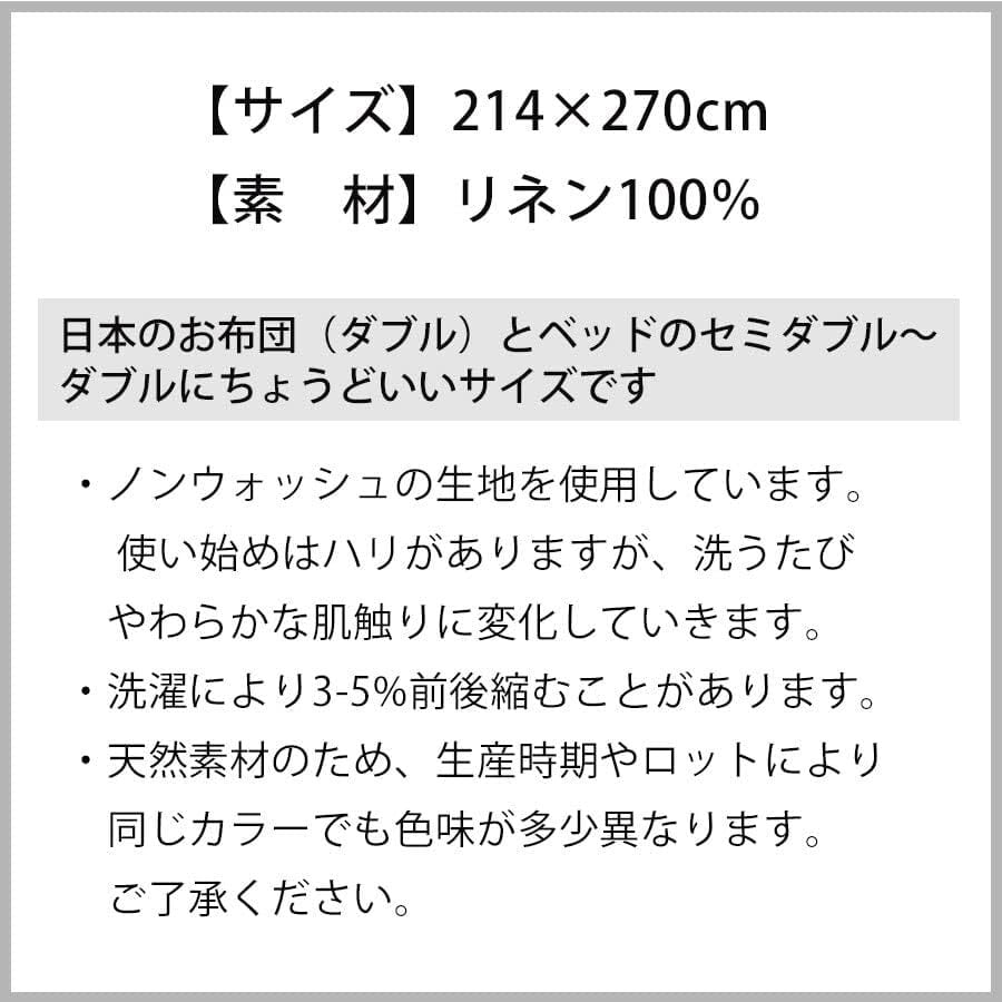 【サイズ 】214×270cm* 縫い合わせ(ハギ)が2か所あります 日本のお布団(ダブル)とベッド用セミダブル~ダブルにちょうどいいサイズ【 素材 】リネン(麻)100%【原産国】日本