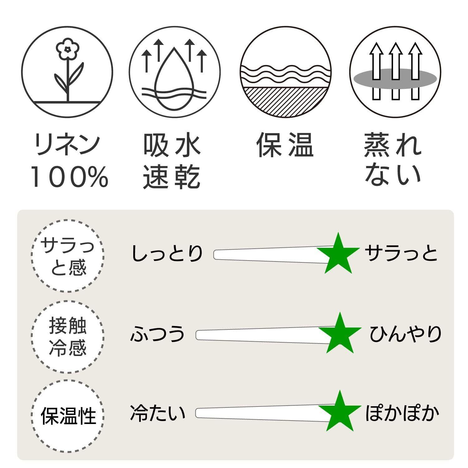 【1年中快適な睡眠を】リネンは優れた熱伝導性を持つ素材で、触れると心地よい涼しさを感じます。同時に繊維の中に湿気を最小限しか残さないので、まとわり付かずさらっとしています。 また中空の繊維構造によって密閉されると体温を保つのが特長です。夏にはさらさらとしたシャリ感で涼しく、冬には蒸れずに心地よい温かさを提供してくれます。