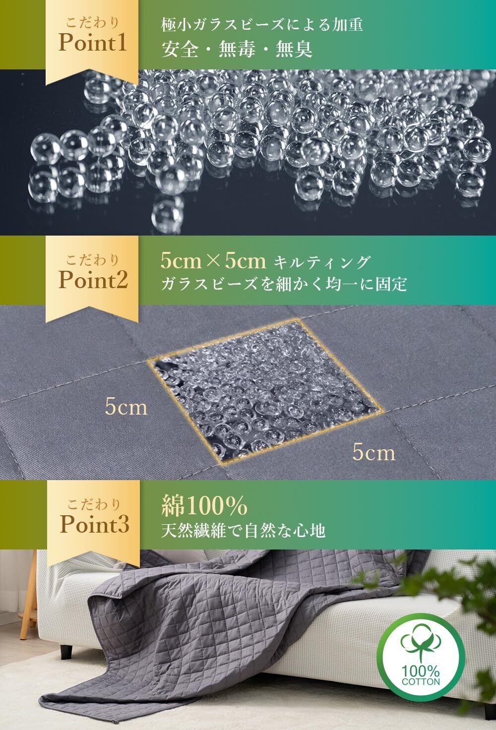 【素材】側地には、肌触りが柔らかく、通気性に優れた綿100%を採用。敏感肌の方でも安心してご使用いただけます。中材には、細かいガラスビーズを混合した綿を使用しており、均一な重さと柔らかさを実現しています。この構造により、体にぴったりとフィットし、快適な圧力を提供します。