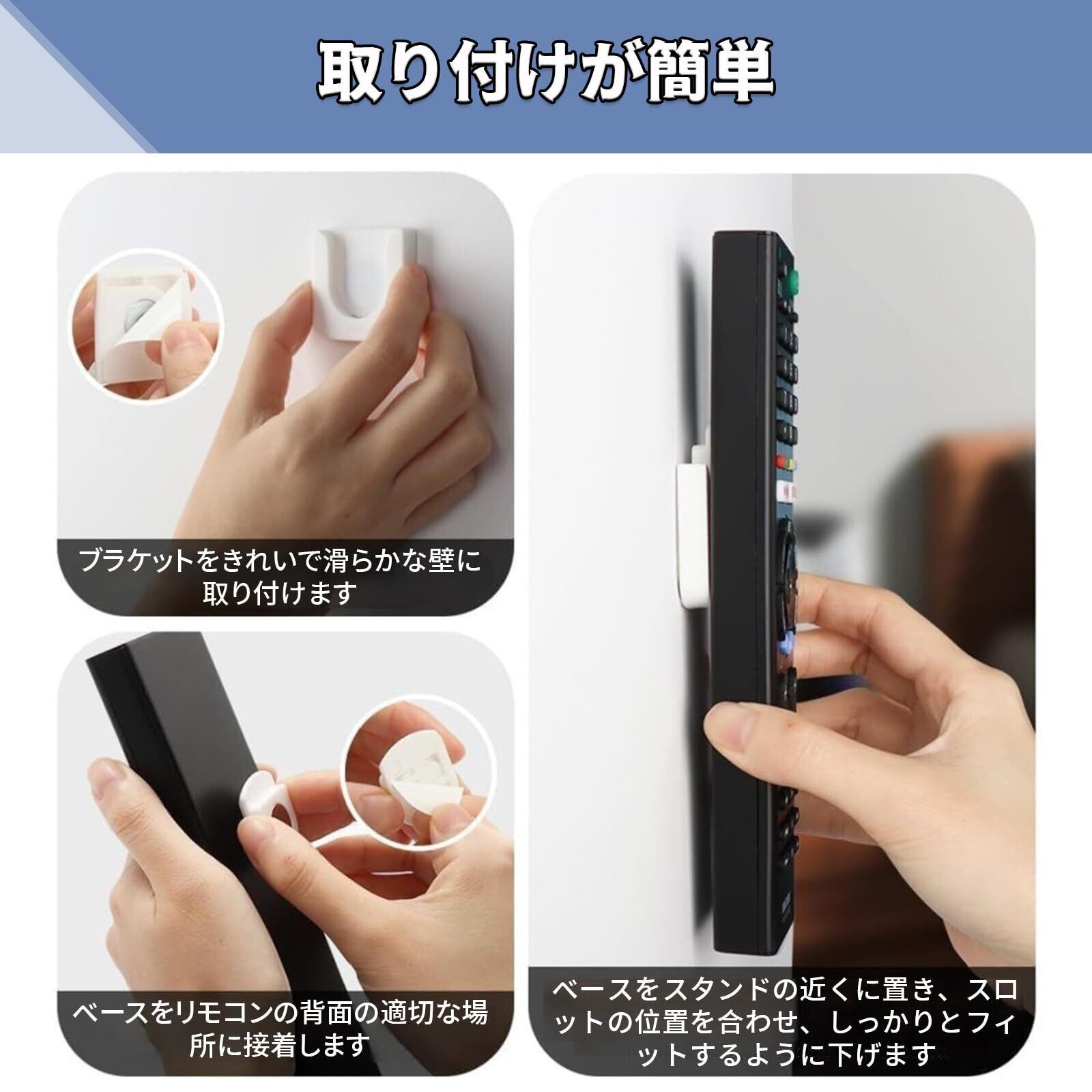 【幅広い用途】テレビのリモコン、エアコンのリモコン、ルーター、電源タップなどの小物の収納に使えます。 キッチン、寝室、リビングルーム、オフィス、ホテルなどの壁、ベッド、テーブルに設置でき、固定されて安定しています。 セラミックタイル、ガラス、金属などの滑らかな表面には使用できますが、漆喰壁などの粗い表面には使用できません。