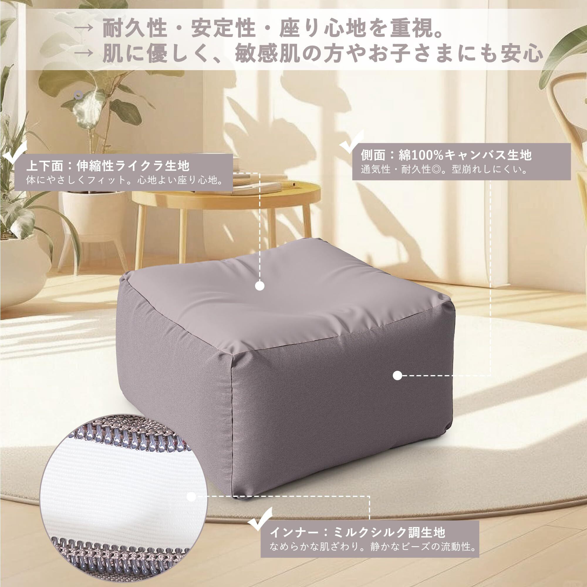 【製品仕様】:サイズ:約65×65×43㎝/【重量】:4.8kg/【カラー】:ダークグレー/【填充物】:0.5mm EPS微粒/【内袋生地】:ミルクシルク生地(95%ポリエステル+5%スパンデックス)/【外カバー】:<側面素材>:しっかりとした厚手の綿帆布(100%コットン) <側面素材>:高弾性ストレッチ素材(ポリエステル90%+ポリウレタン10%)