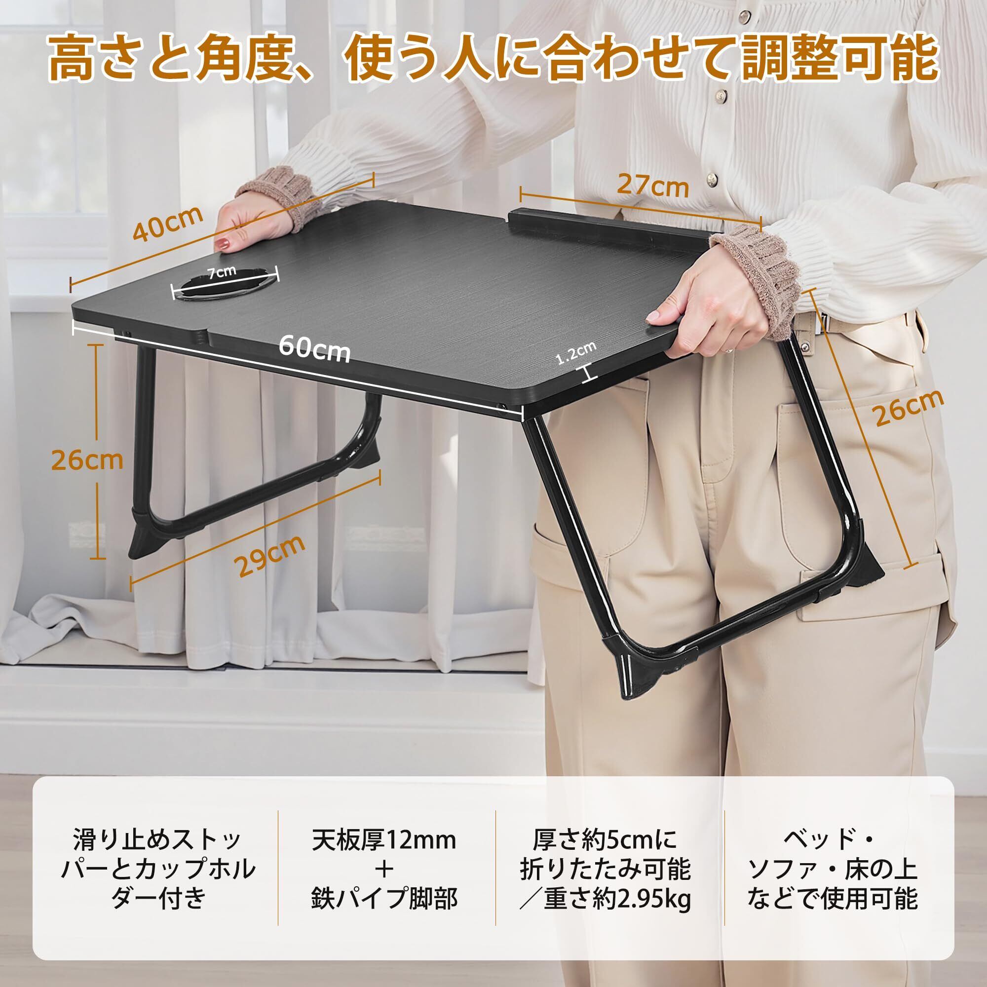VECELO オリタタミテーブル 幅55cm × 奥行き32cm × 高さ25cm 高さ5段階調整 2.55kg 耐荷重45kg 片側リフトアップ式 安定感強化 12mm厚天板+PVC縁加工 滑り止めストッパー搭載 ドリンクホルダー付き マウススペース付き パソコンデスク ベッド ローテーブル 多機能 省スペース コンパクト 完成品 ブラック【日本正規輸入品】